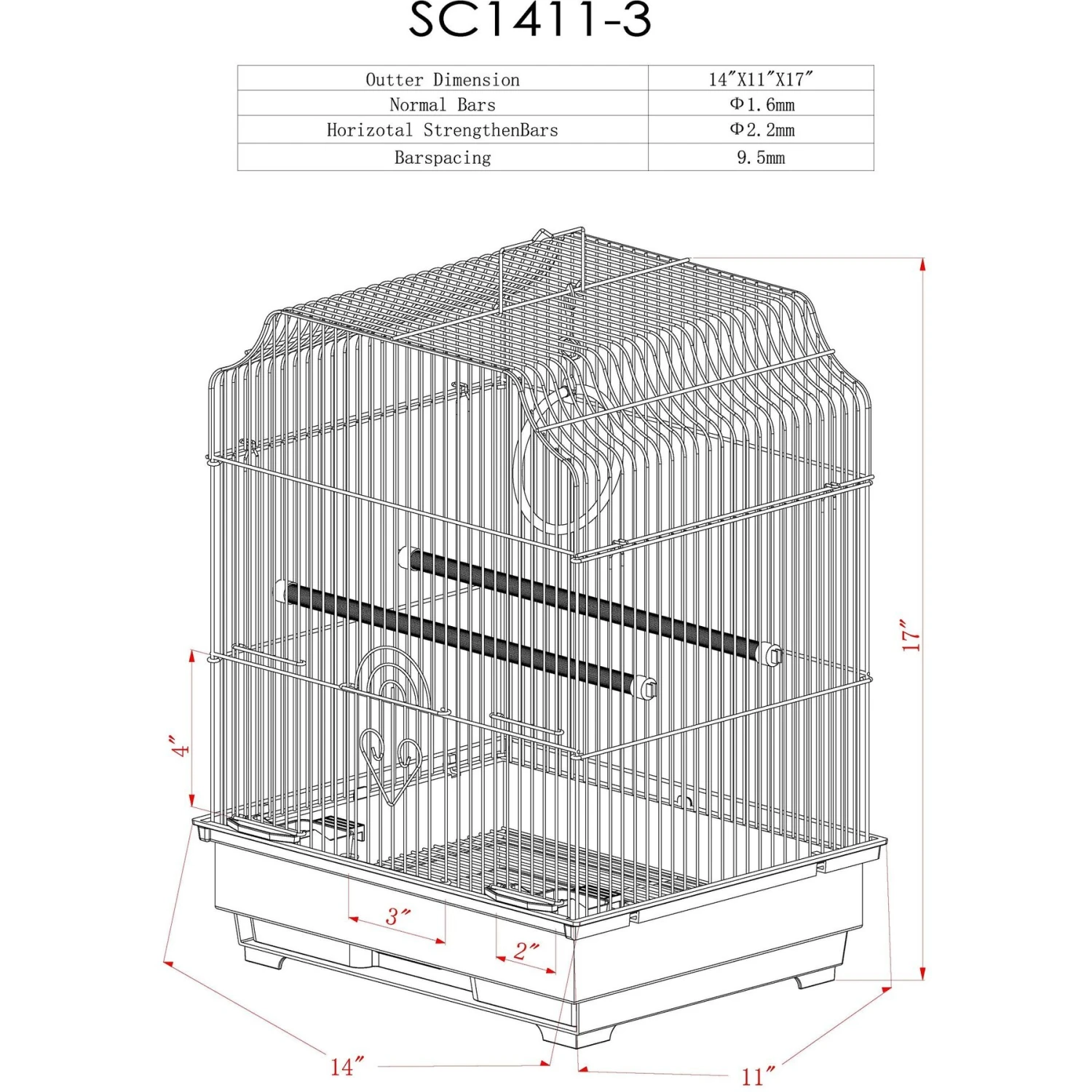- Comes with 3 perches and 2 plastic feeders.