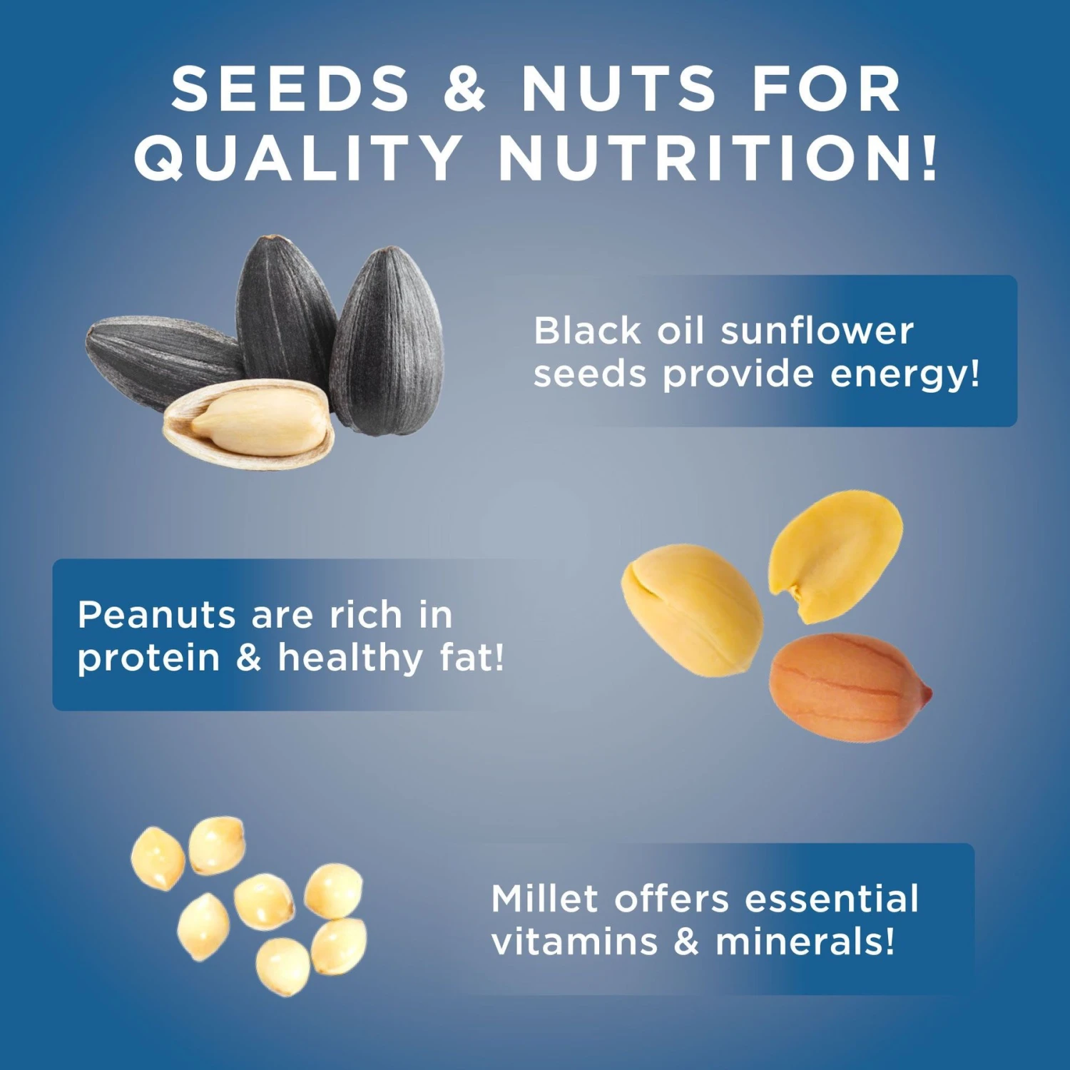 - A blend of millet, black oil sunflower seed, peanuts, and more.