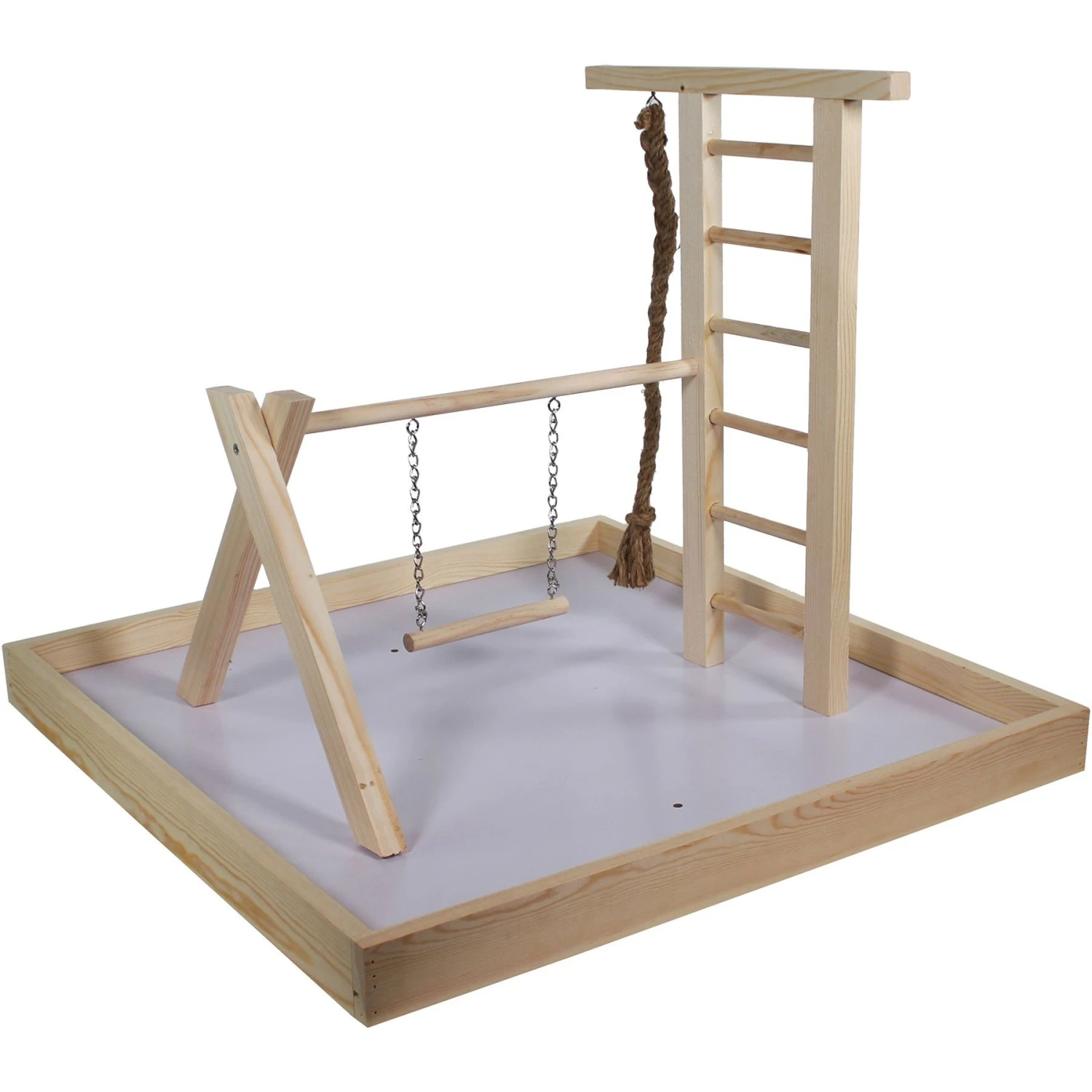 - Includes a 6-step ladder, a play swing, a seesaw, 2 perches and an easy-to-clean, laminated base.