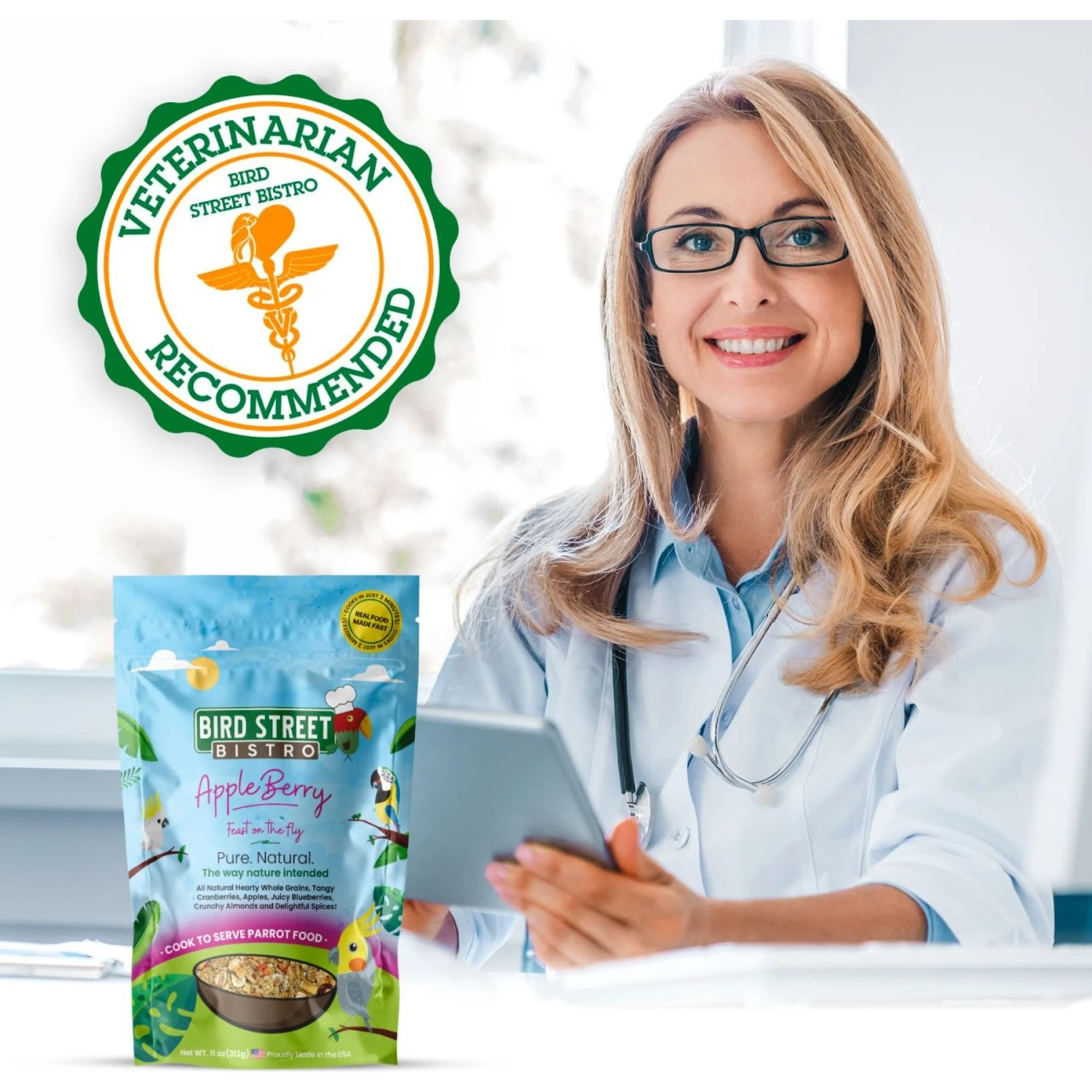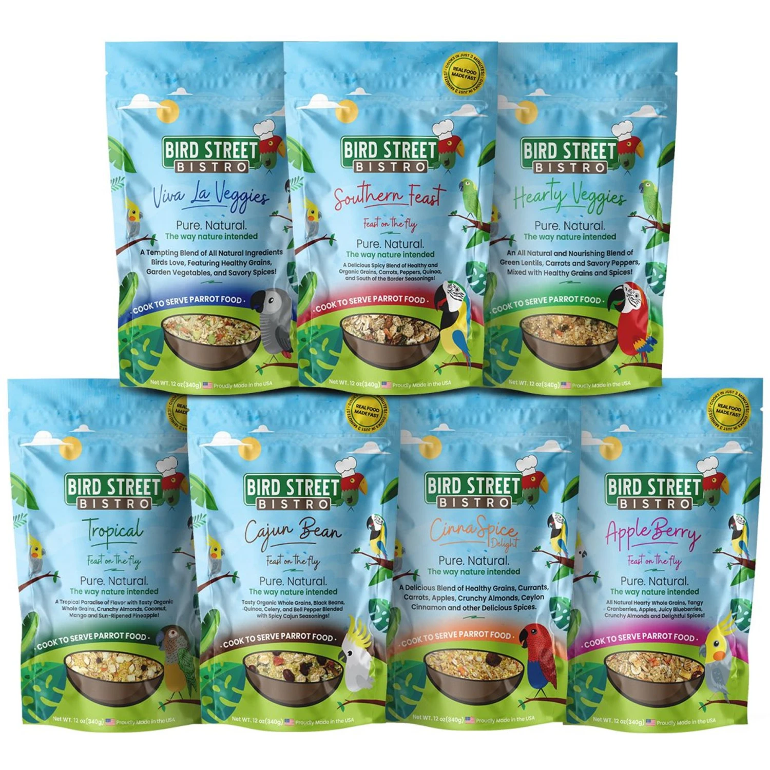Give your mini mate a little variety at mealtime with the Bird Street Bistro Variety Pack Bird Food. This variety pack of 100% natural food for birds is crafted with organic whole grains, delicious fruits, vegetables and healthy spices without any added fillers, sulfites, sugars, salt, artificial flavors, colors or preservatives. Each flavor is designed to cook in just 3 minutes as scrumptious scents fill the air. This organic bird food variety pack is great for macaws, African greys, parakeets and more. It is formulated with human-grade ingredients to help keep your beaked buddy feeling happy and healthy.