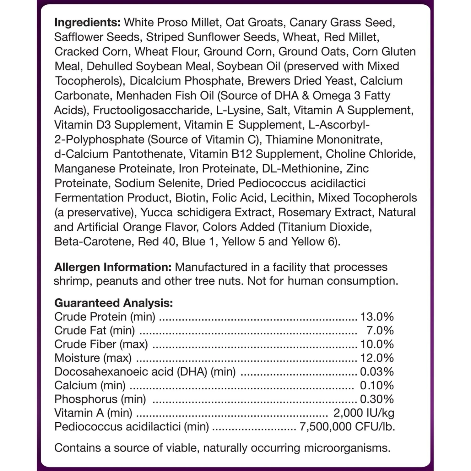 - Blended the highest quality select seeds and grains together and topped it off with our colorful, vitamin-packed food shapes that make feeding time exciting, tasty, healthy and fun
