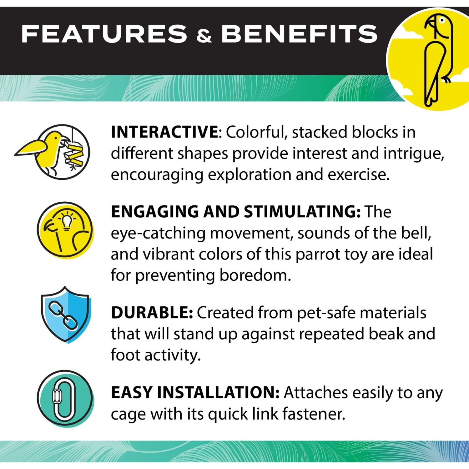 - Your feathered friend is sure to be fascinated with the distinctive shapes and vibrant colors.
