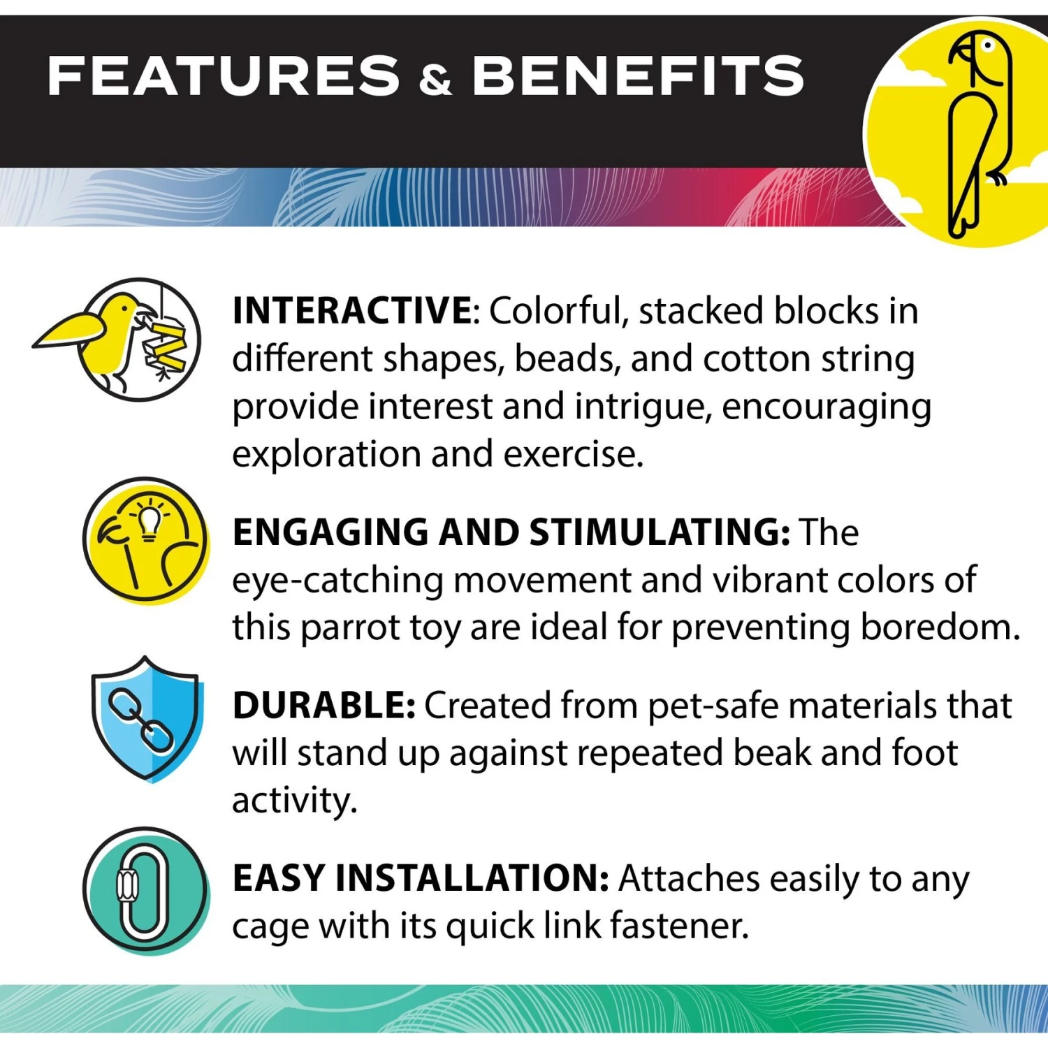 - Your feathered friend is sure to be fascinated with the distinctive shapes and vibrant colors.