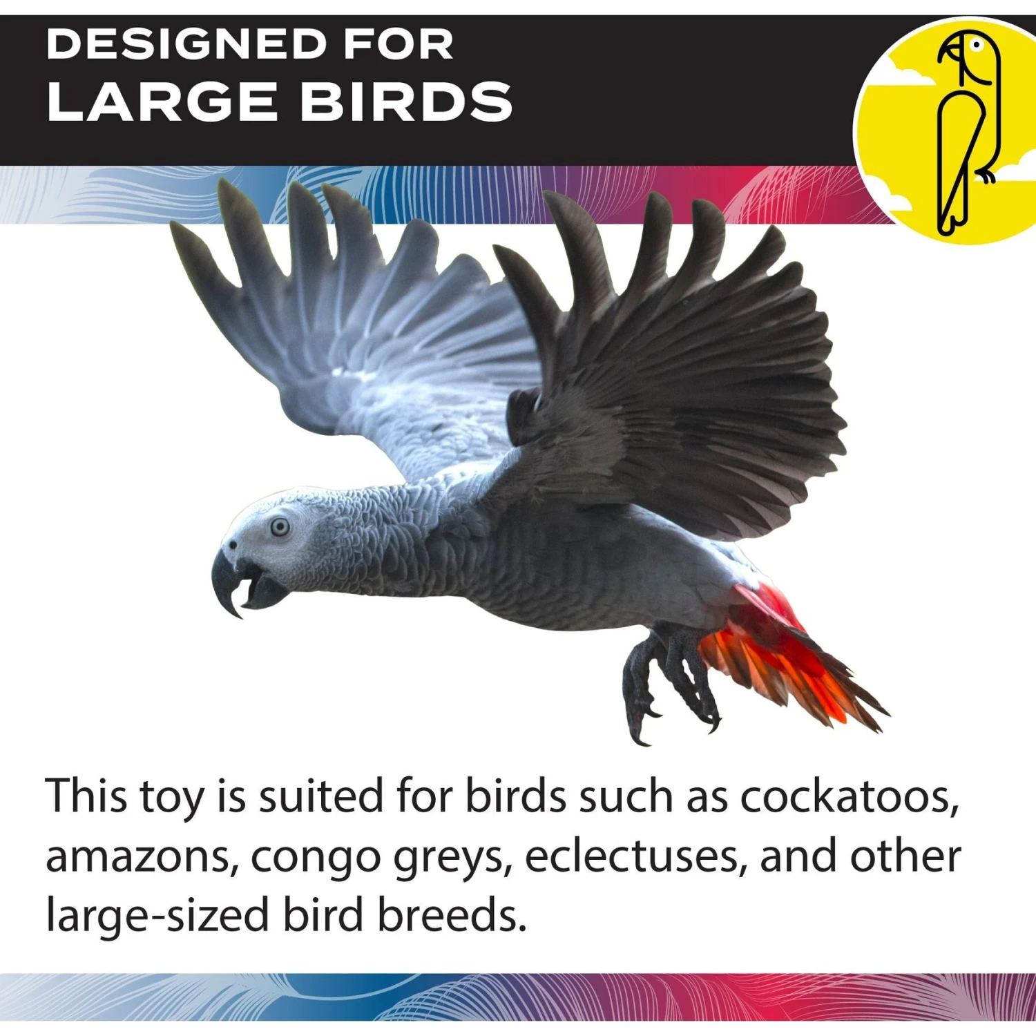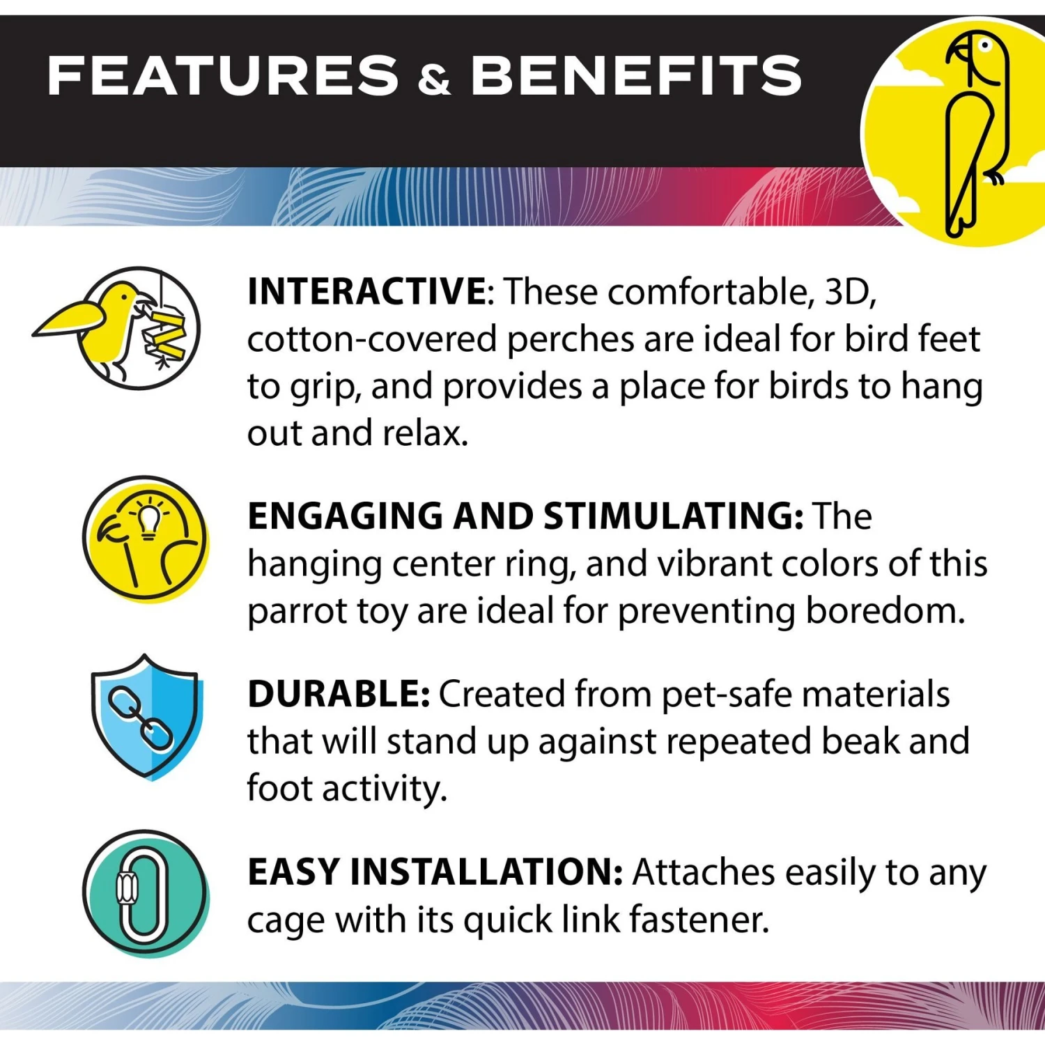 - Your feathered friend is sure to be fascinated with the distinctive shapes and vibrant colors.