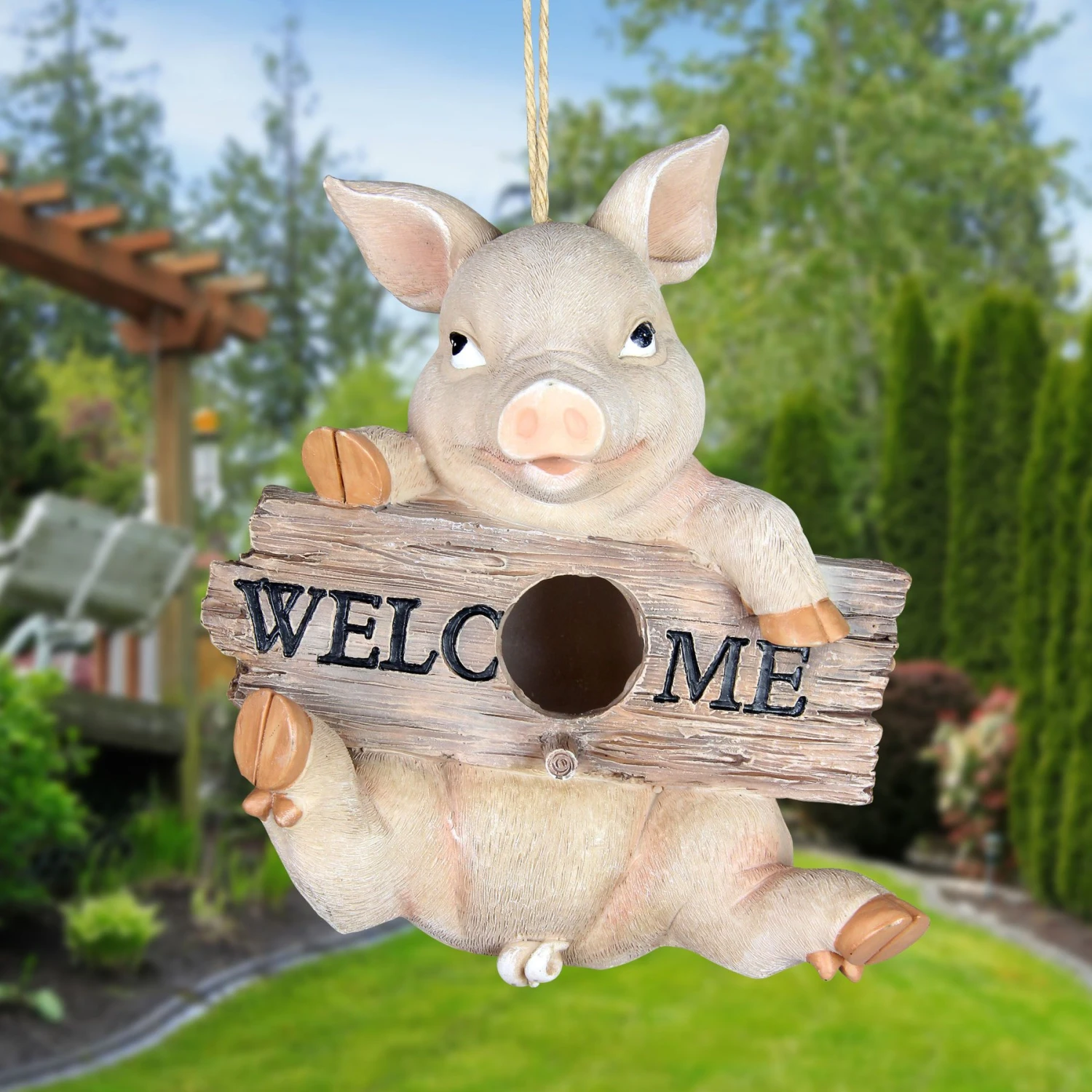 - Hand-painted design features a plump piggy ready to welcome your feathered friends home.