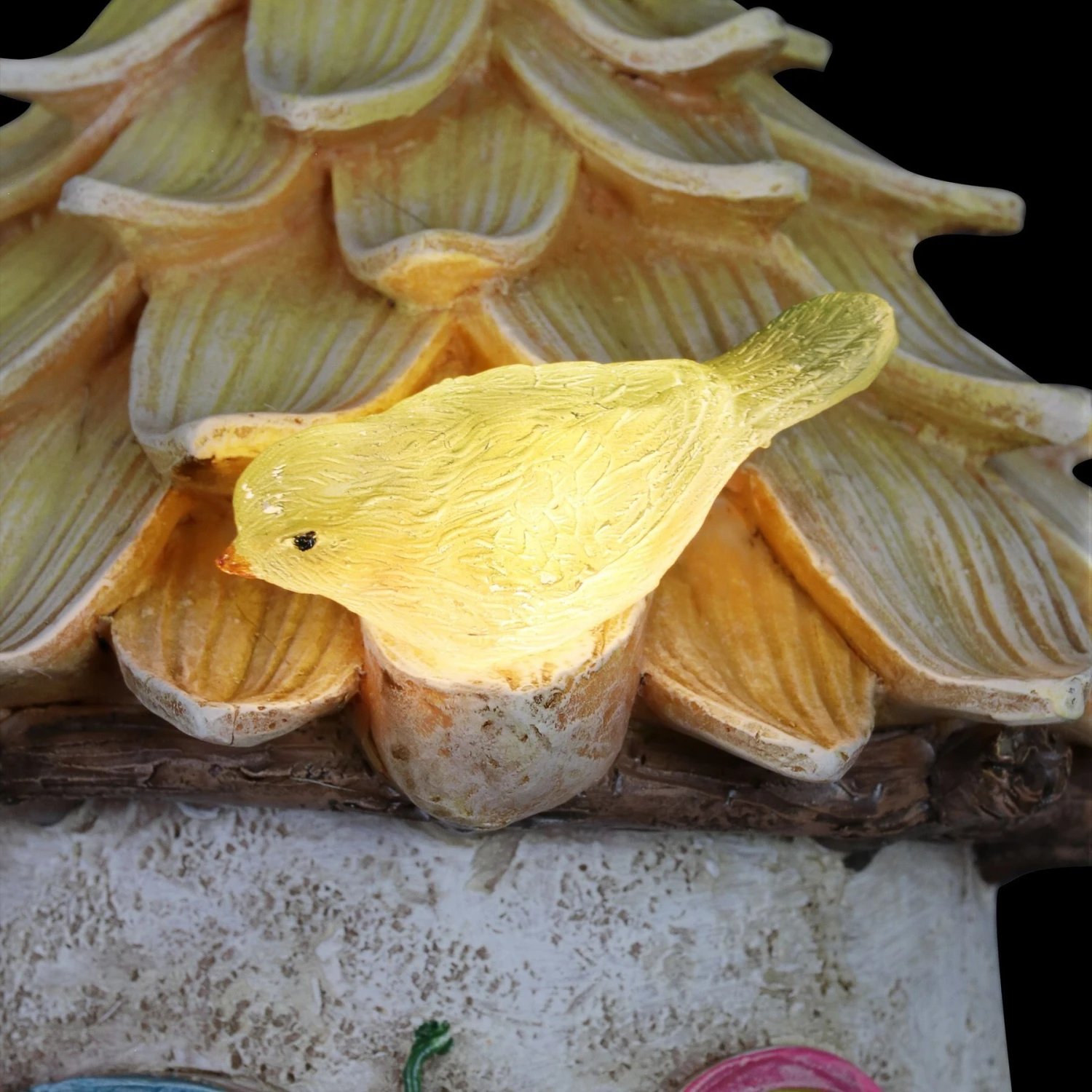 - A solar-powered LED light automatically illuminates the rooftop bird at dusk.