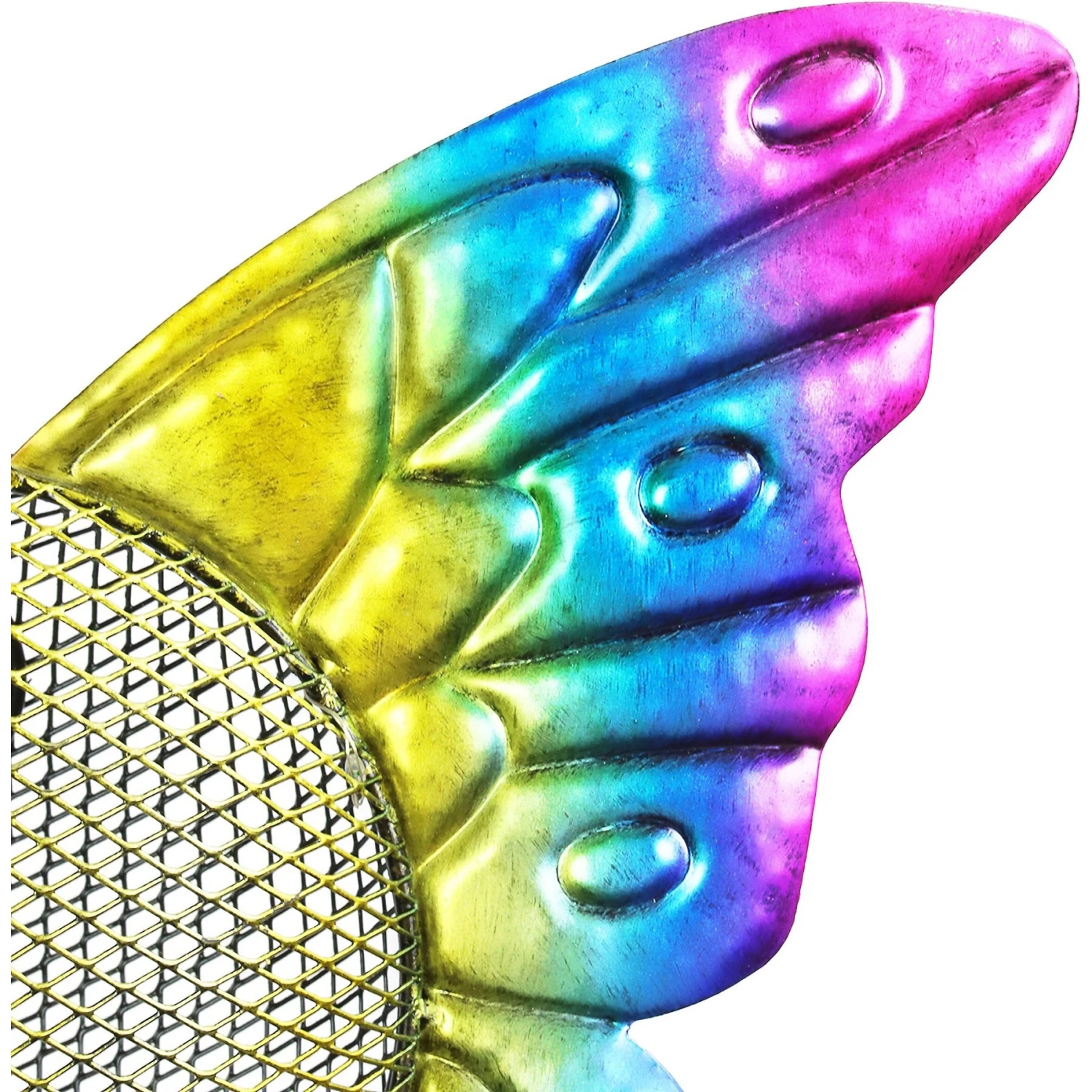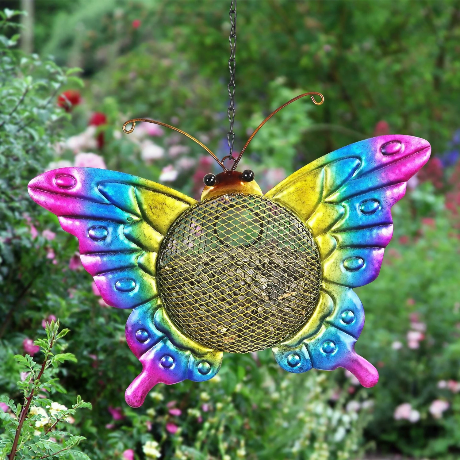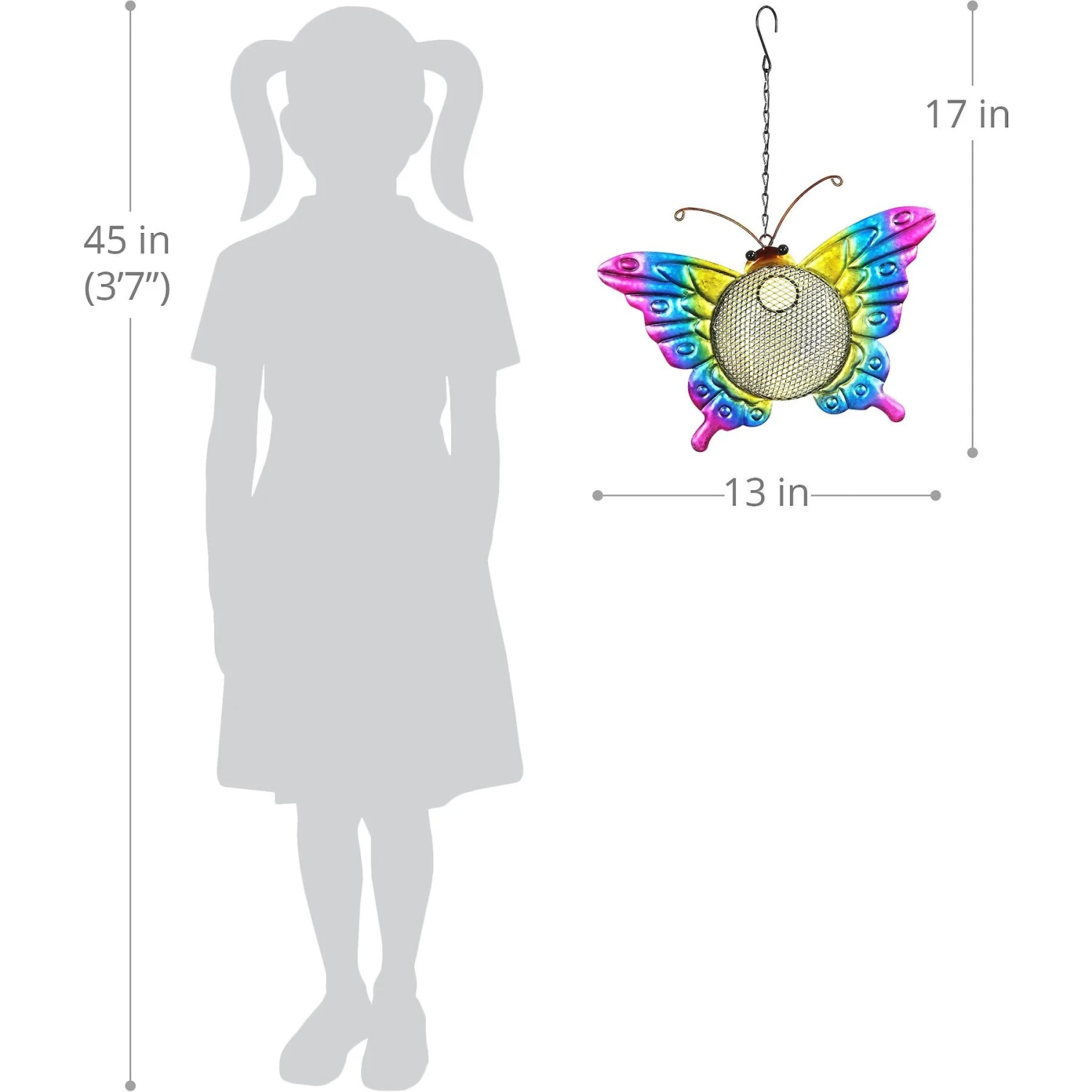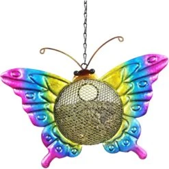 Winged friends will flock from all over the yard to feed at the Exhart Solar Hanging Metal Mesh Butterfly Bird Feeder during the day. When dusk falls, the feeder illuminates for evening visits. The convenient mesh basket is easy to fill with birdseed (sold separately) makes for easy snacking access. A charming addition to any garden, this feeder also makes a great gift.