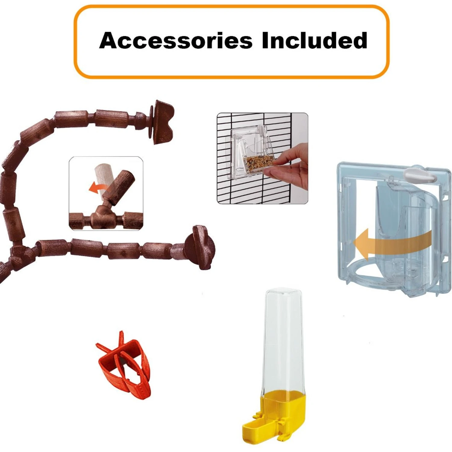 - Includes tons of accessories, like a drinking bottle, food clip for veggies and flexible plastic modular perches.