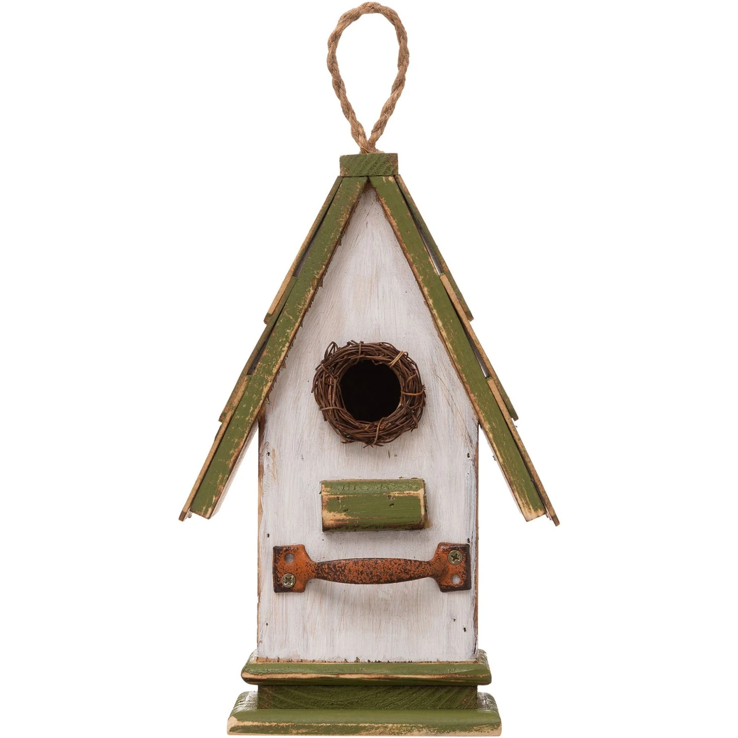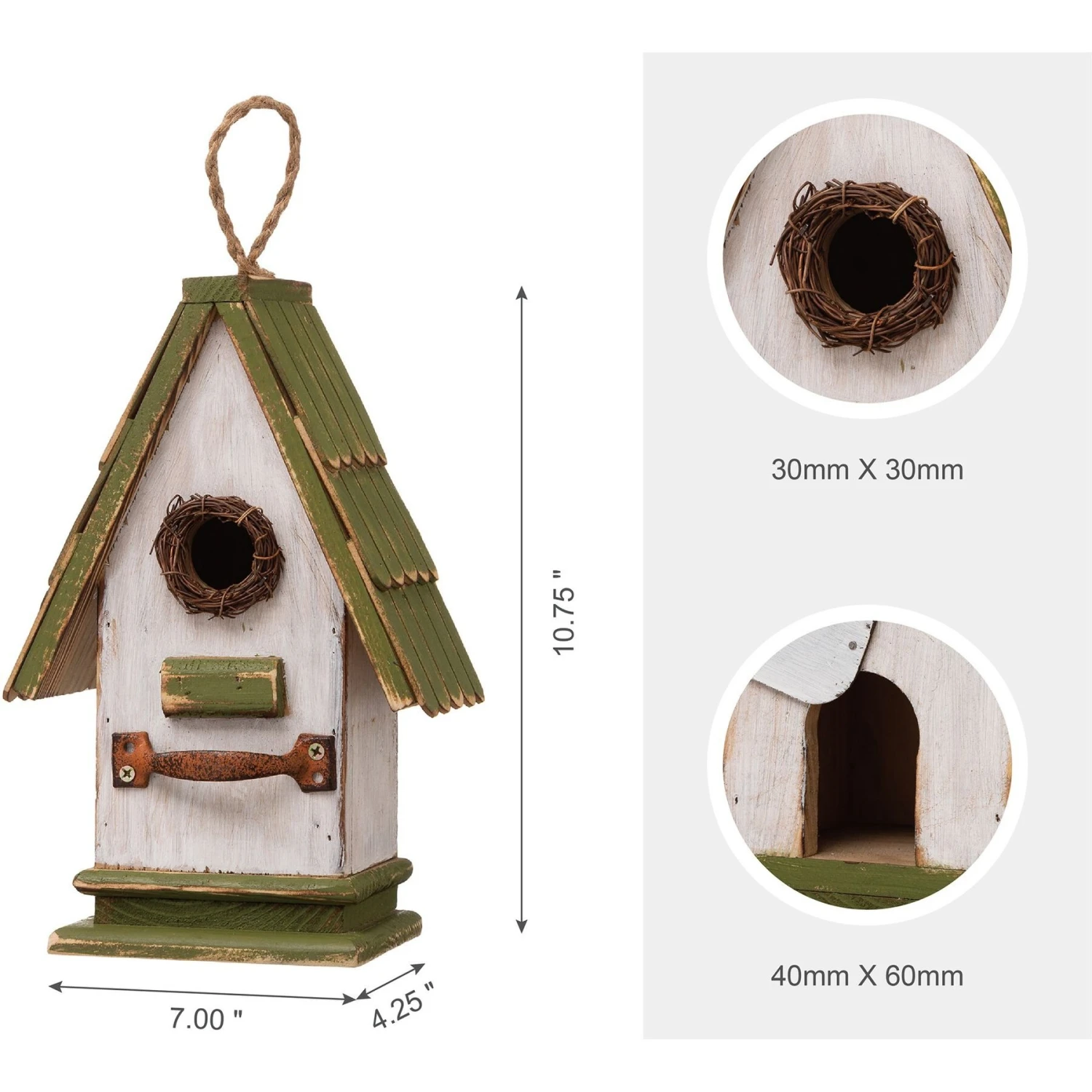 - Distressed finish helps the birdhouse blend in with its’ surroundings.