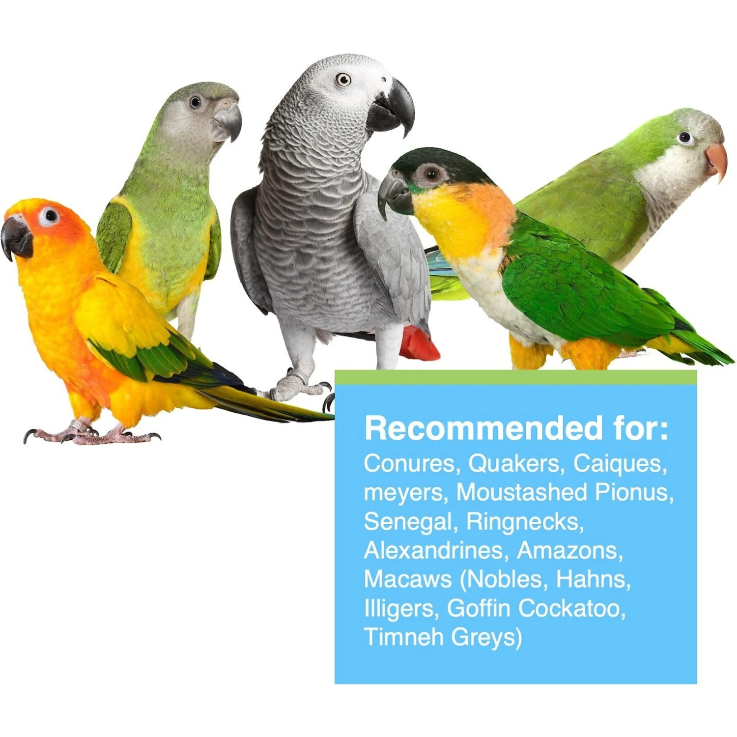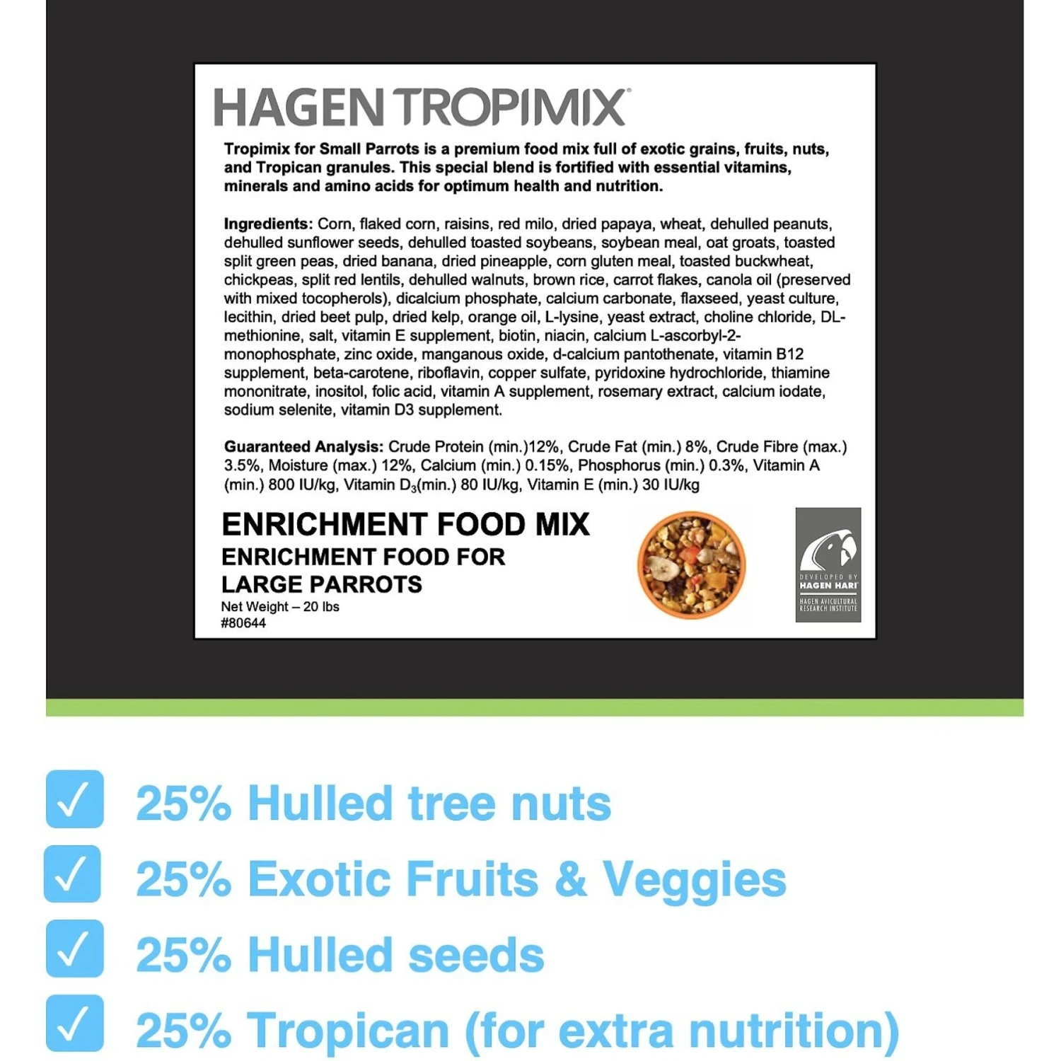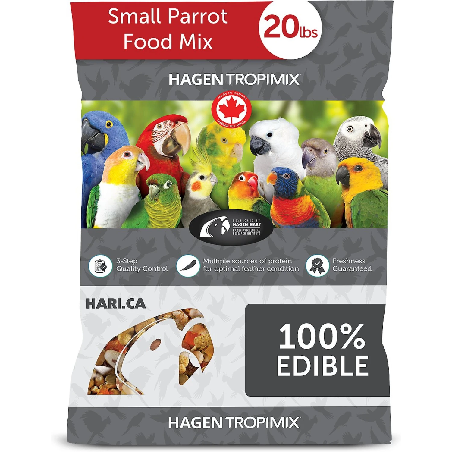 - Vitamin and mineral-fortified 100% edible blend of hulled grains, legumes, nuts and fruits for small parrots.