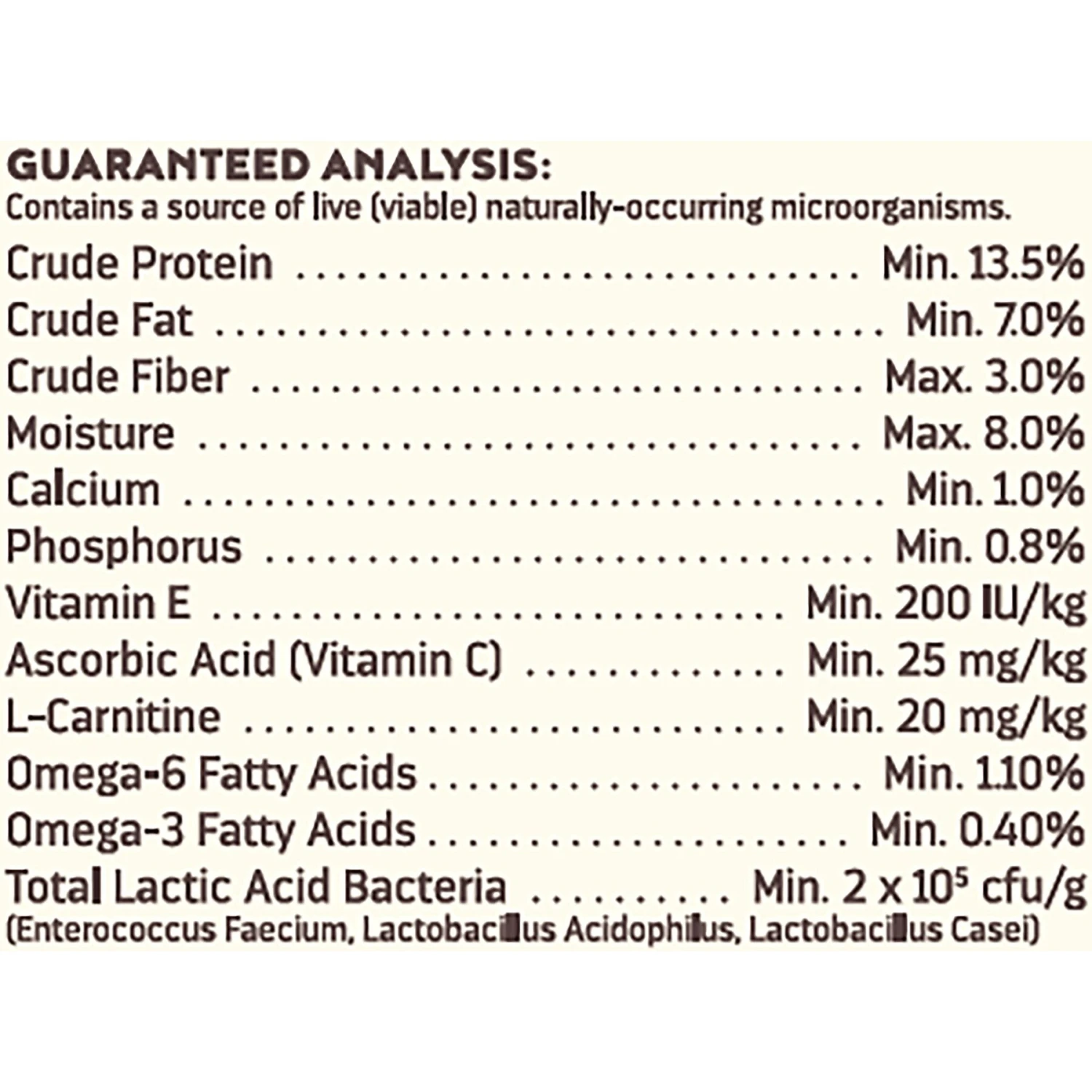 - Contains no artificial preservatives or flavors, no corn and no loose seeds or grains.