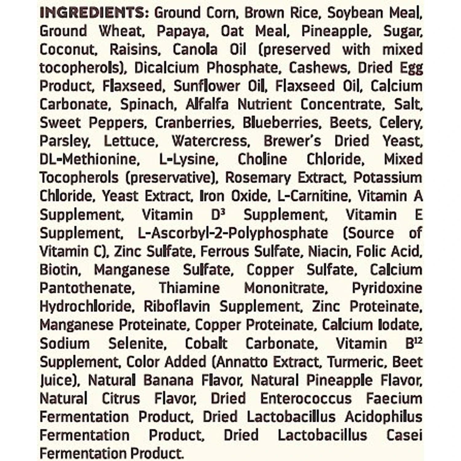 - Contains no artificial preservatives or flavors, no corn and no loose seeds or grains.