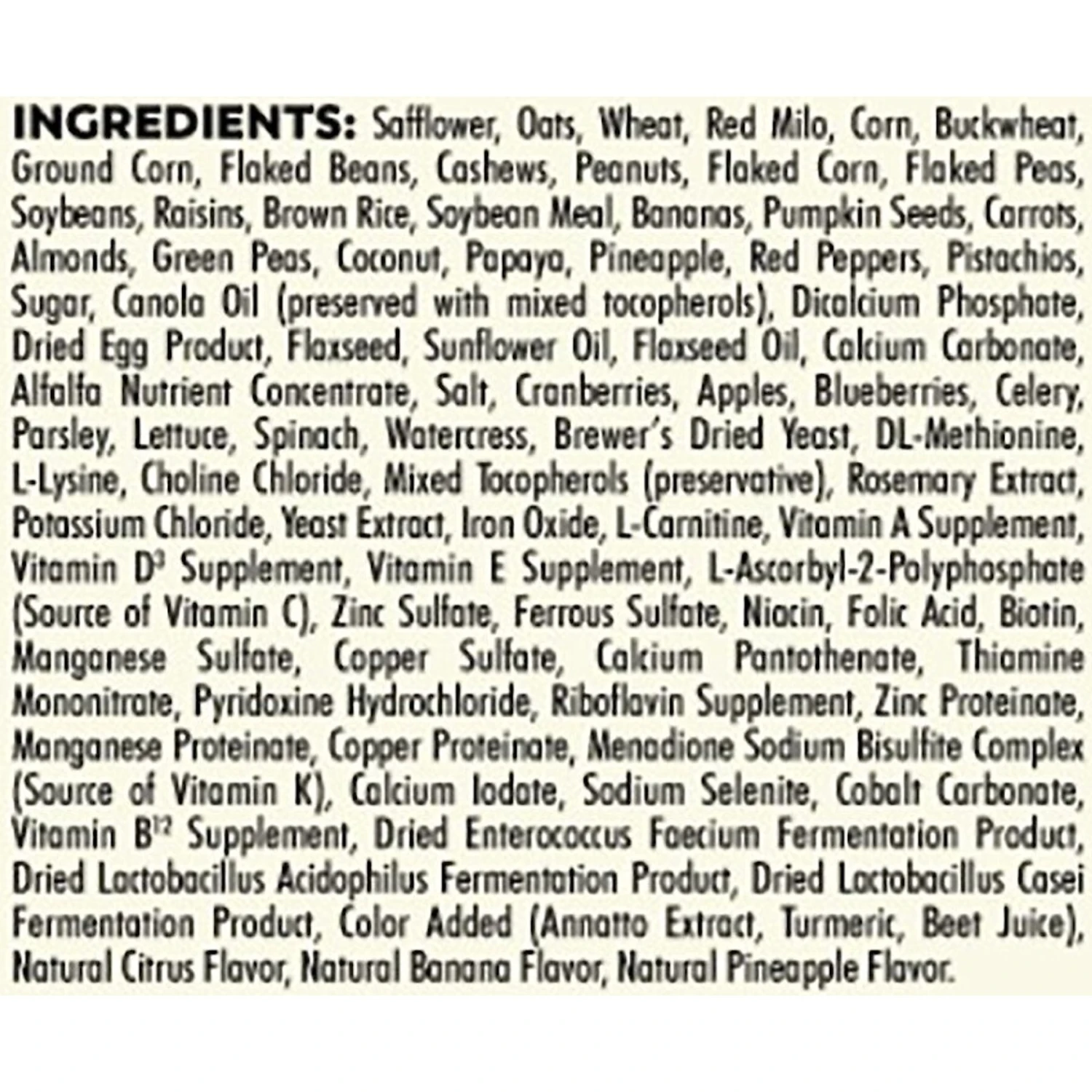 - Specially made for parrots with safflower seeds and gourmet blend of veggies, fruits, and legumes.