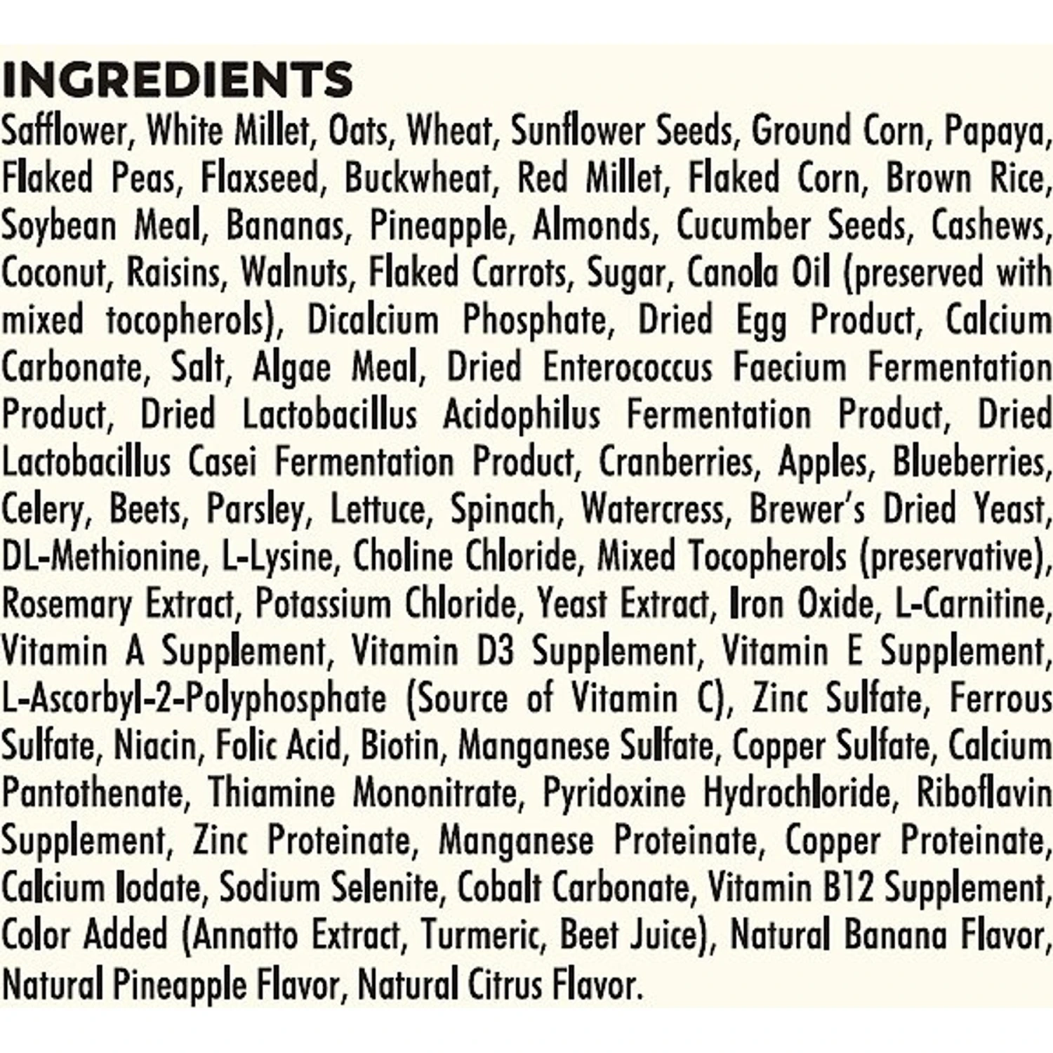- A food and treat all in one, loaded with natural, exotic dehydrated fruit, veggies, nuts, legumes and more!