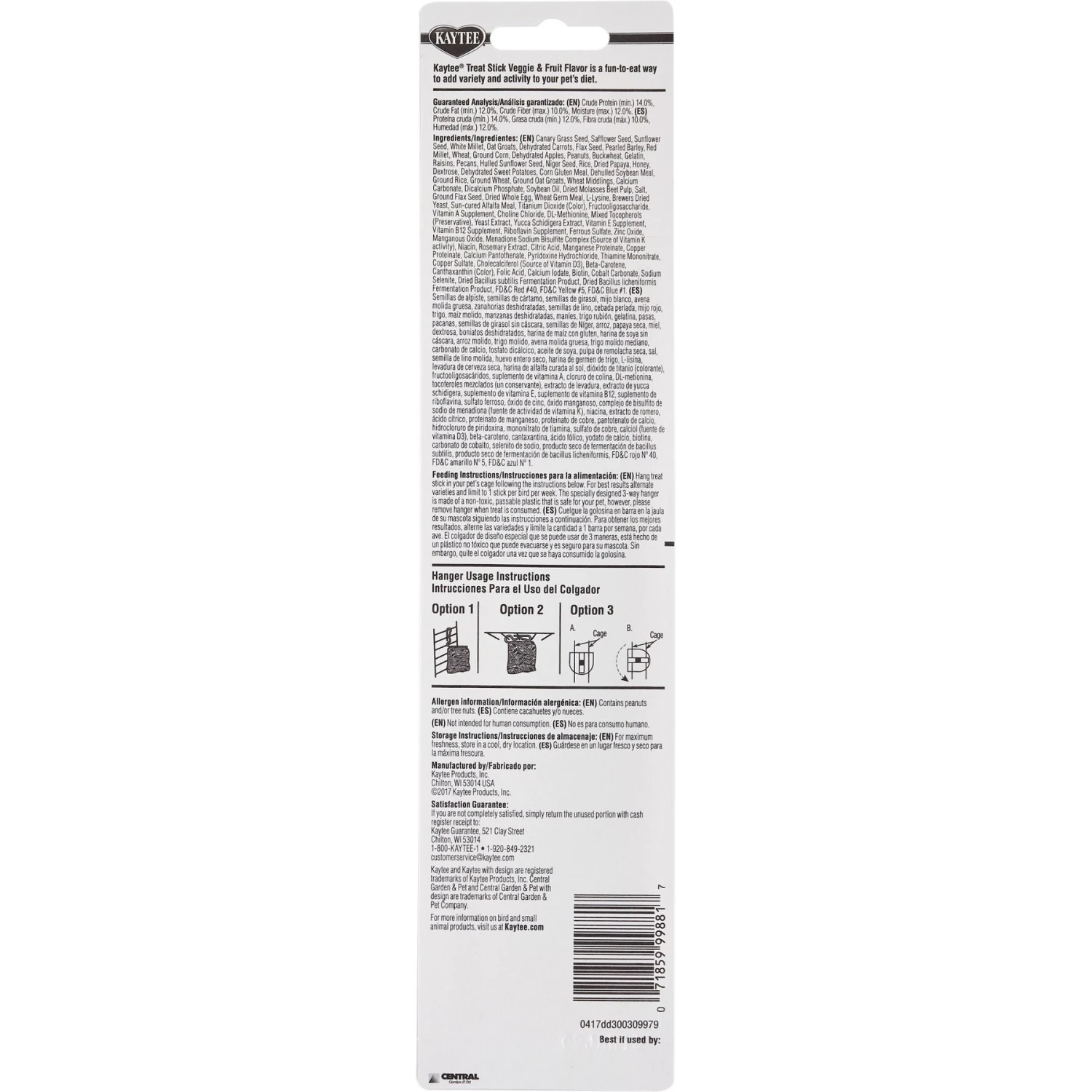 Feed your bird a healthy treat that’s also fun to eat with Kaytee Fiesta Fruit & Veggie Cockatiel Treat Stick. Cockatiels are intelligent birds and love a challenge, especially when there is a delicious reward involved. The Kaytee Fiesta Fruit & Veggie Cockatiel Treat Stick is a fun, treat that is coated with a tempting blend of seed and dehydrated carrots, apples, papaya and raspberry. Just hang it in your bird’s cage for a fun, mentally stimulating activity that will alleviate stress and prevent boredom. Plus it’s a great way to add variety to your bird’s diet. For best results, alternate flavors and limit to one stick per week.