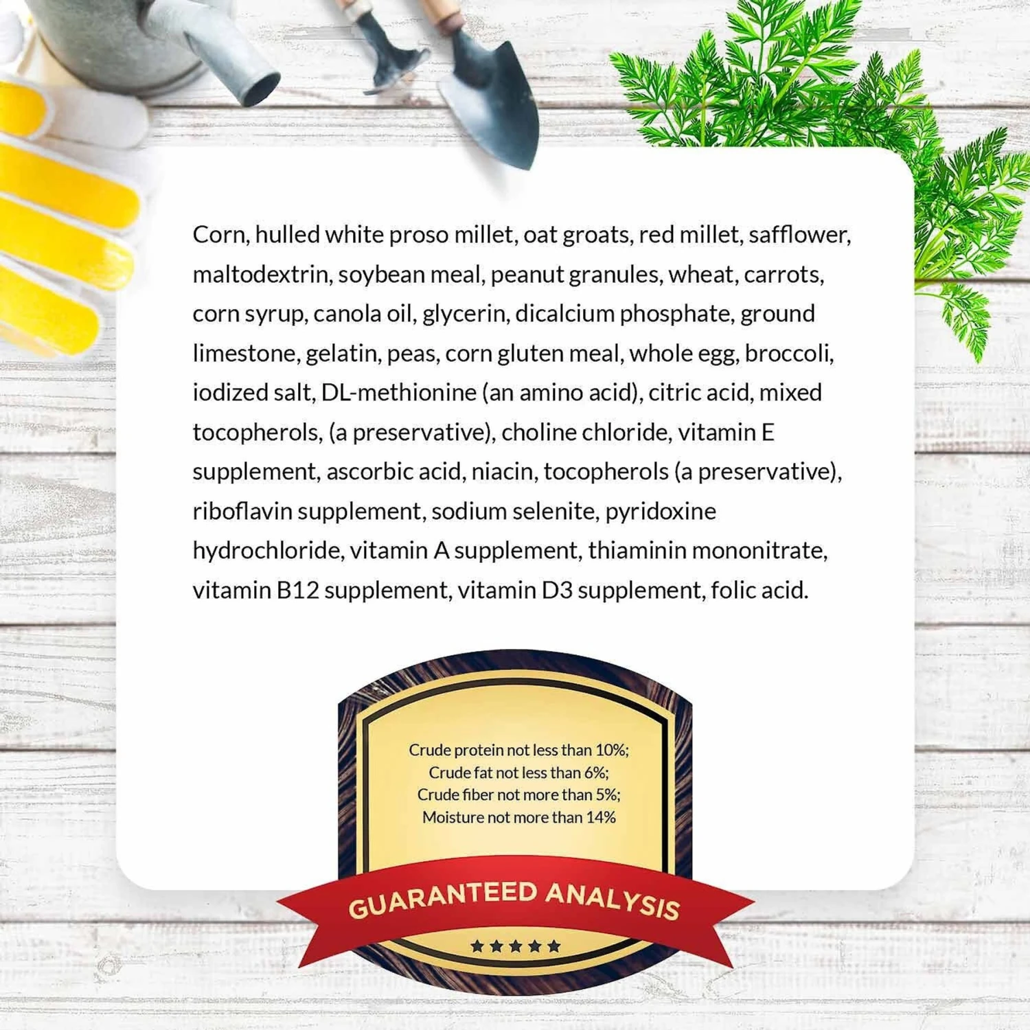 - Unique shape and formulation includes savory nuts and grains as well as carrots, peas, broccoli and corn in a fun-to-eat shape that promotes foraging and mental stimulation.