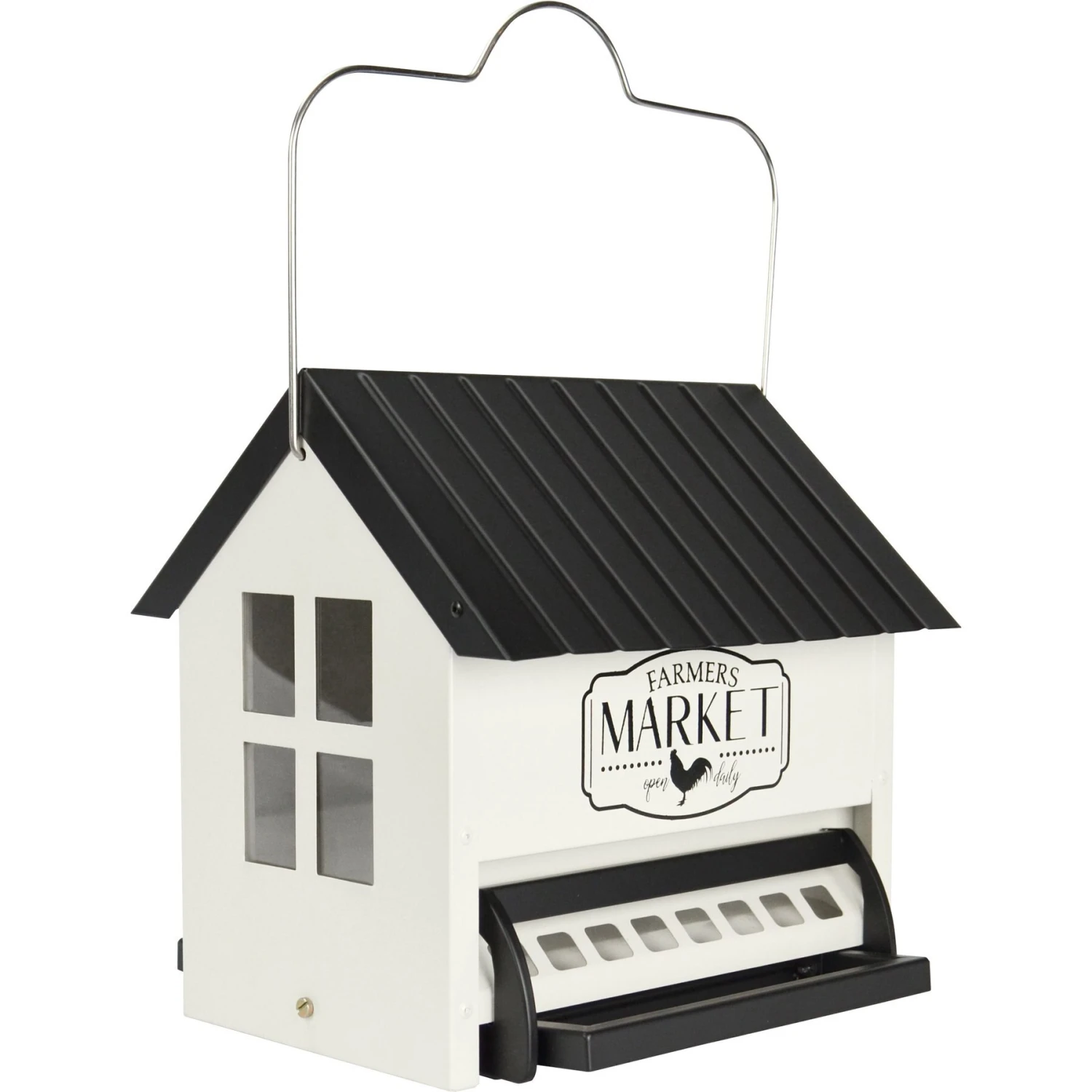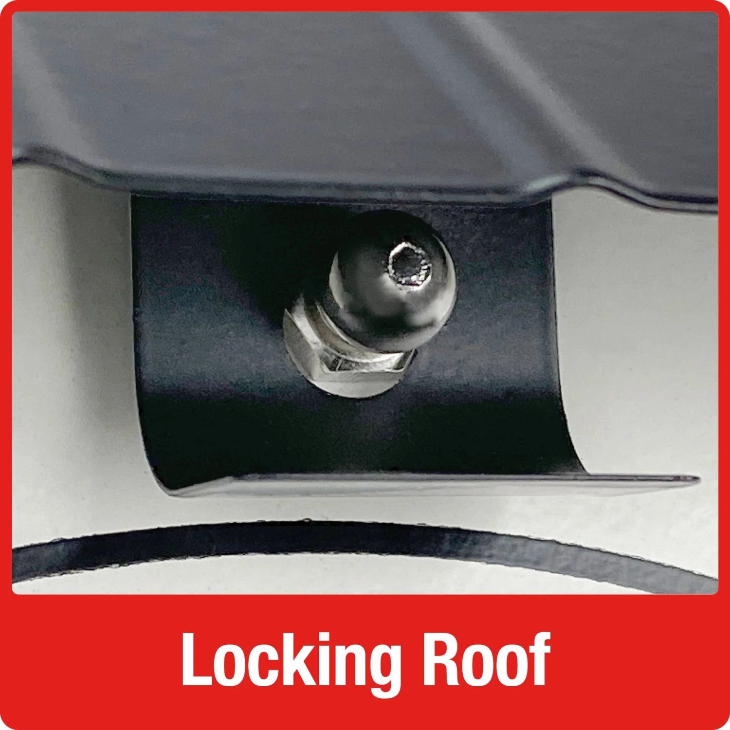 - Durable powder-coated metal locking roof, base, feed ports and perches.