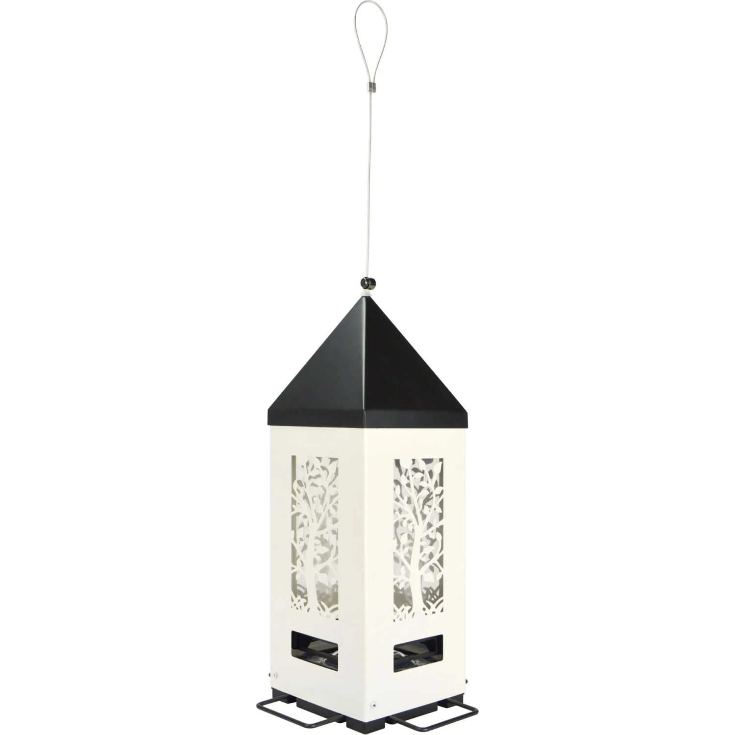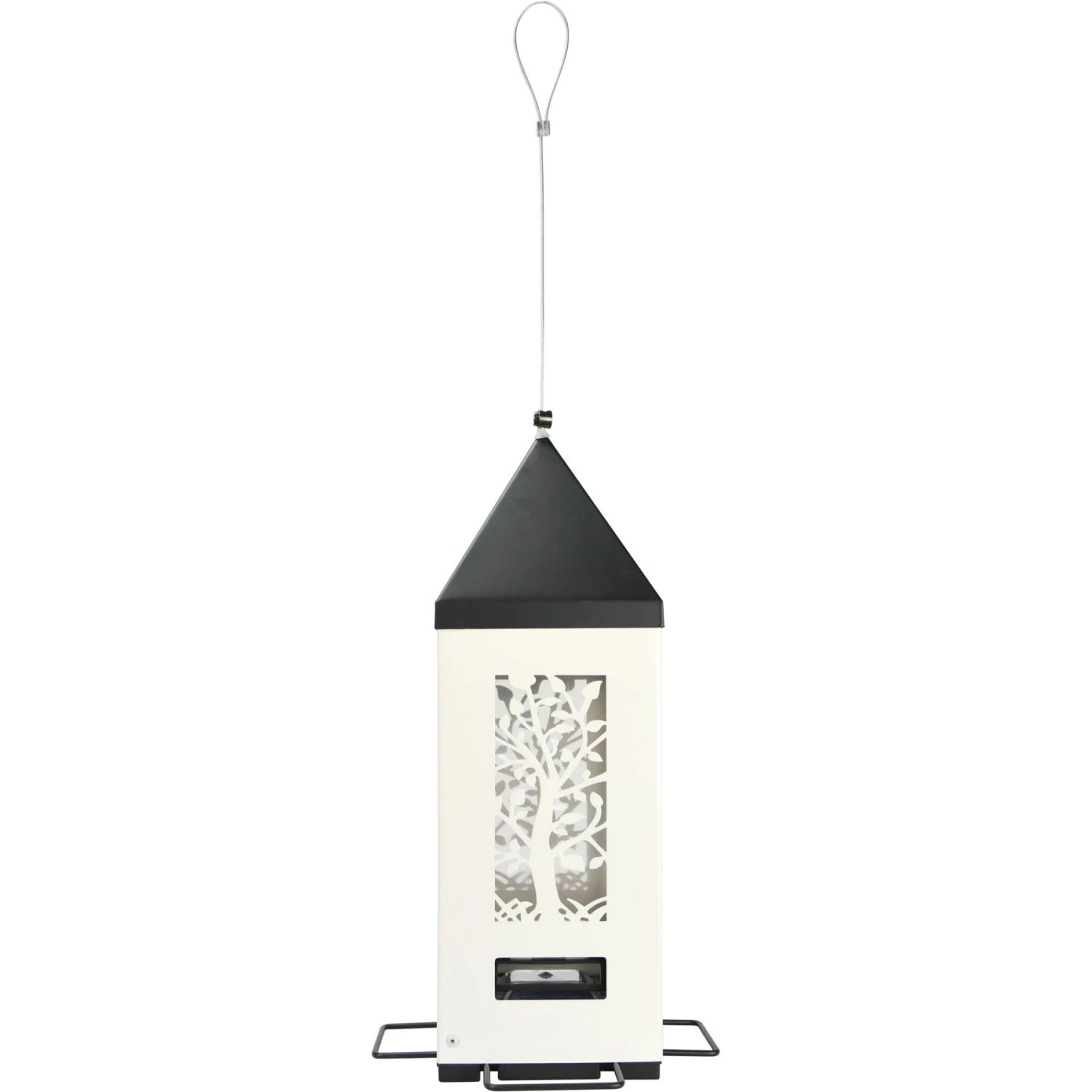 - Durable powder-coated metal locking roof, seed shield, external unit and perches.