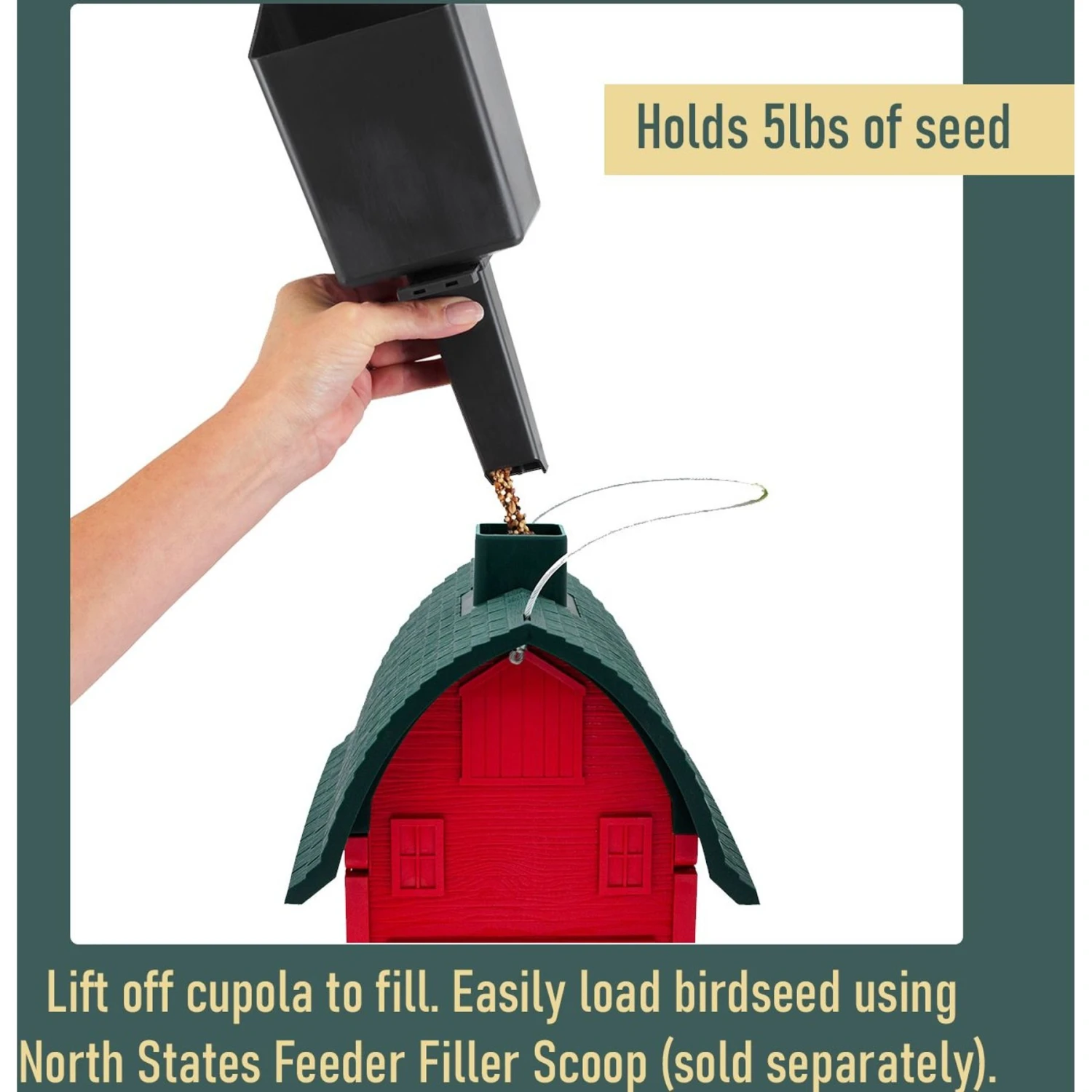 - Each design holds eight pounds of seed for your feathered friends to enjoy.