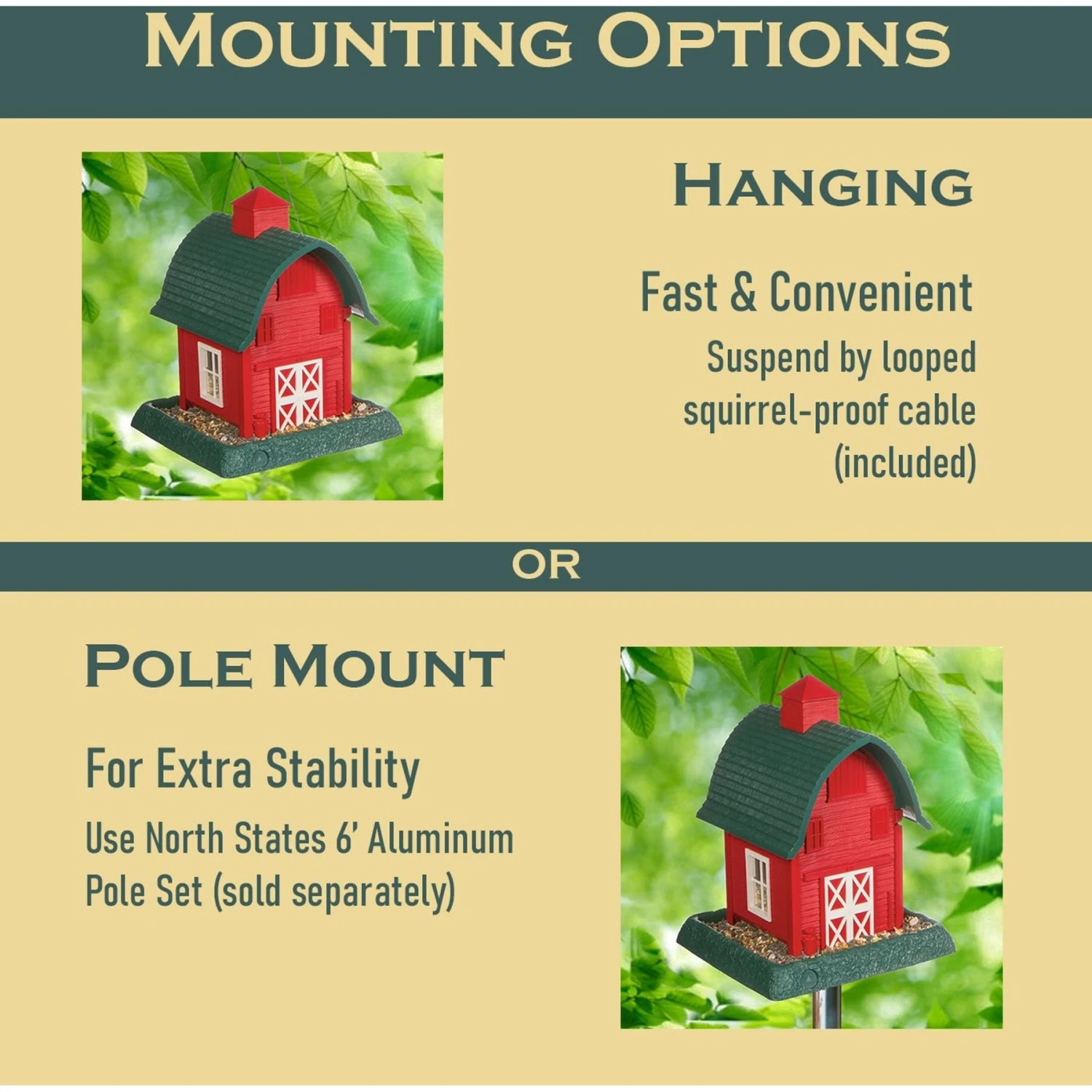 - Bird feeding station can be hung or pole mounted. Comes with a squirrel-proof cable for hanging.