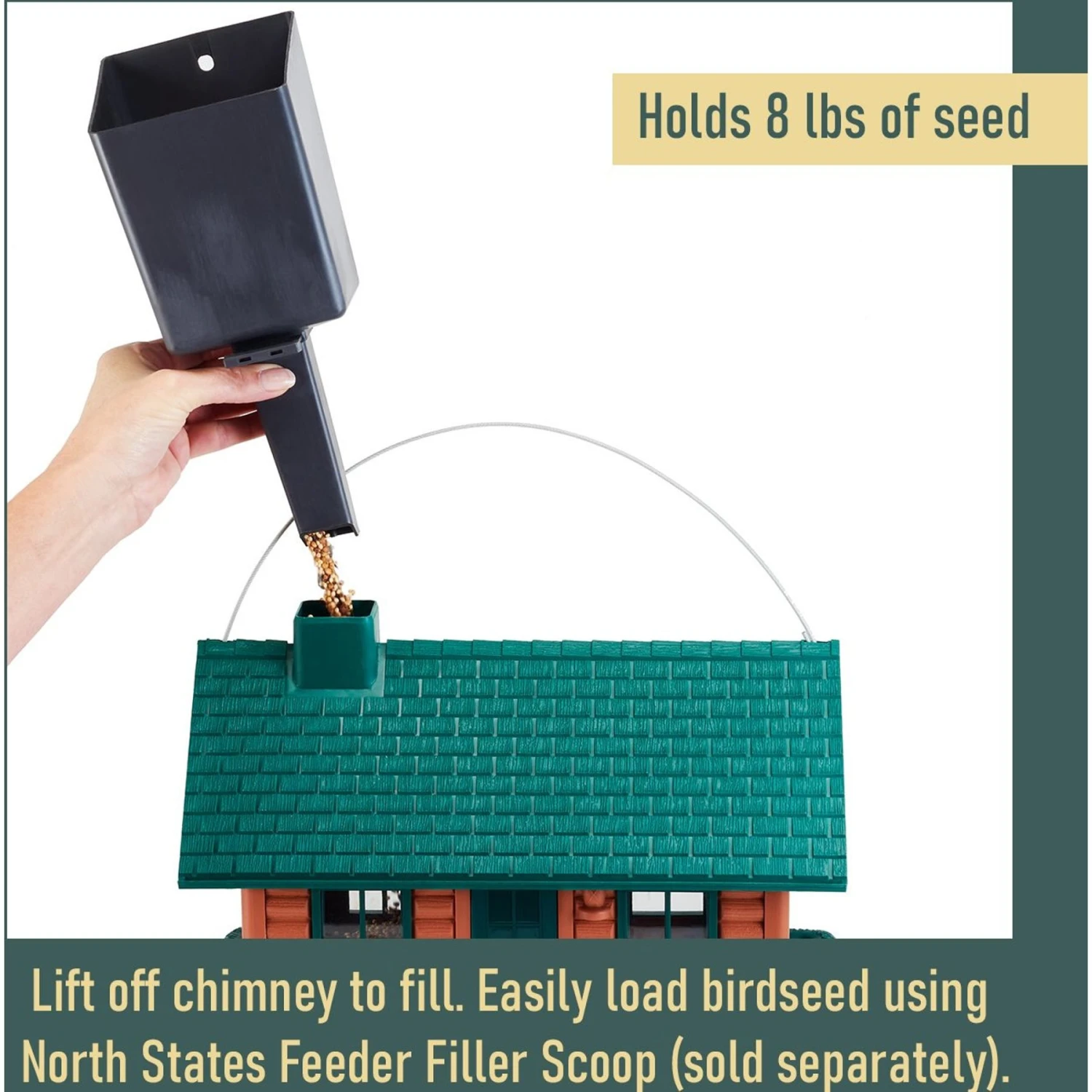 - Each design holds eight pounds of seed for your feathered friends to enjoy.