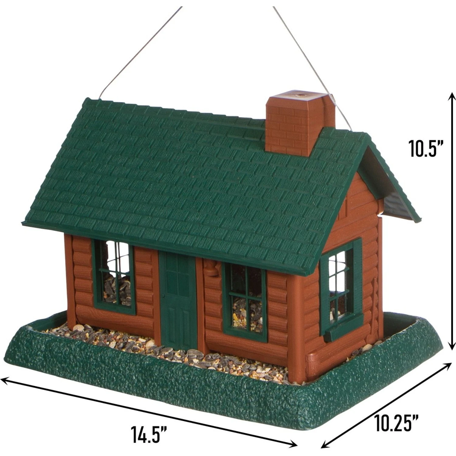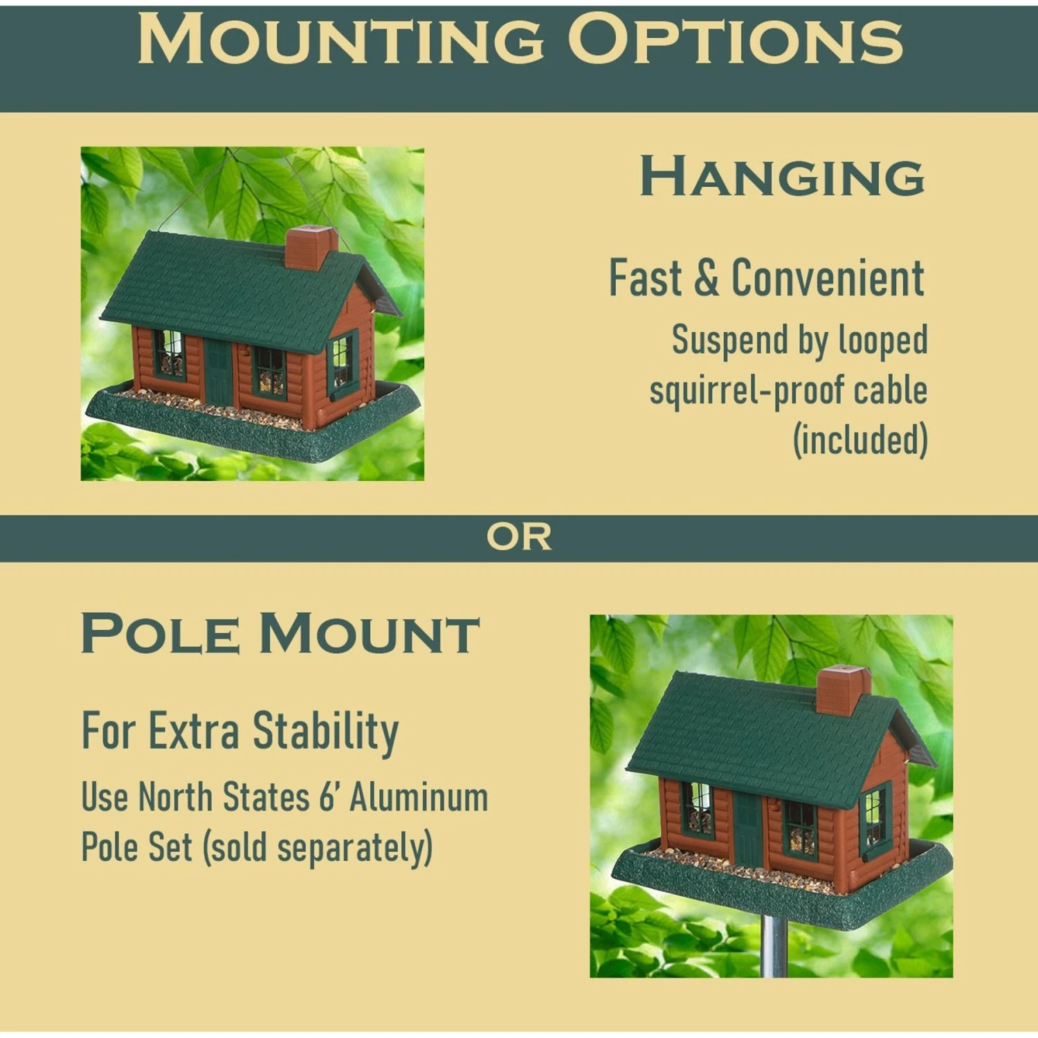 - Bird feeding station can be hung or pole mounted. Comes with a squirrel-proof cable for hanging.