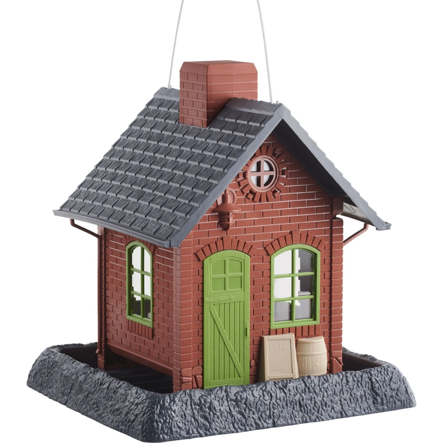 - Unique bird feeder that resembles a miniature pub with a green door and arched windows.