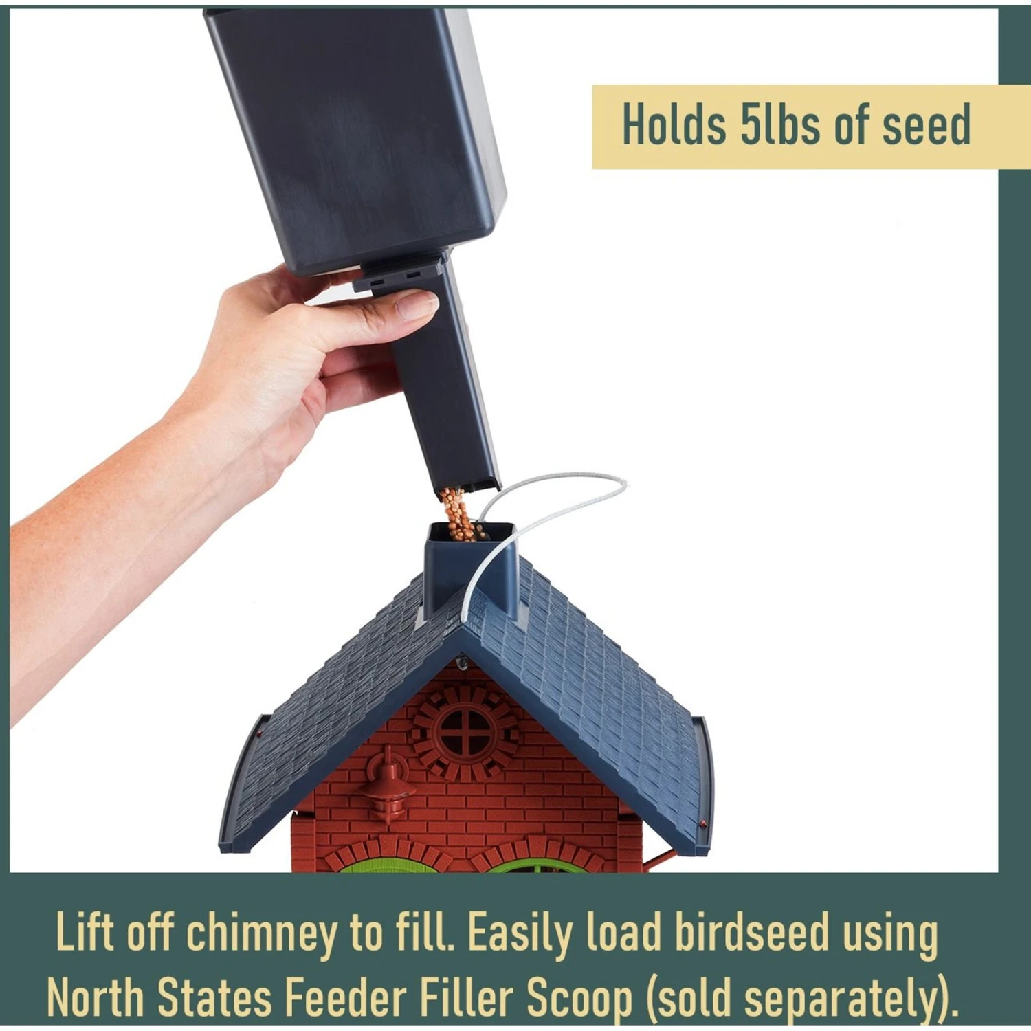- Fills easily through lift-off roof and has windows to help monitor the seed levels.