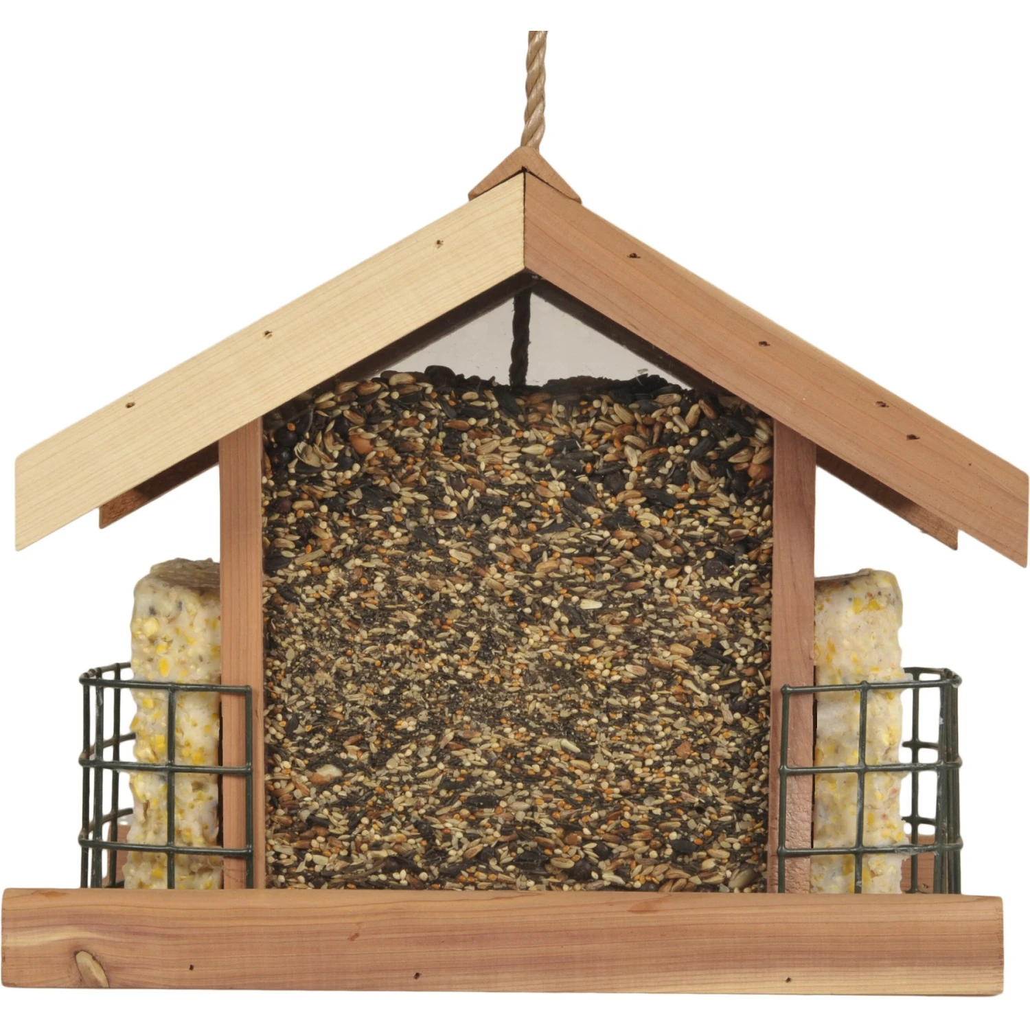 - A charming wood feeder that holds not only seed, but two suet cakes as well, attracting all kinds of birds, near and far