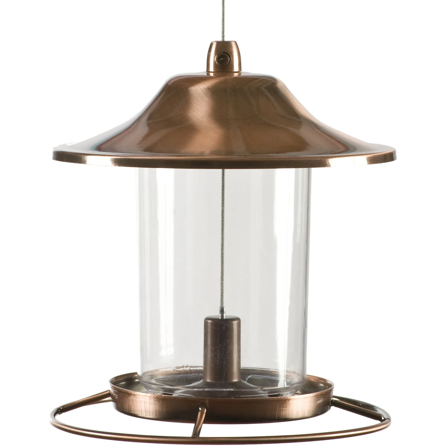 - The innovative design of this feeder allows the seed to dispense into the tray and it stops dispensing once the tray is full