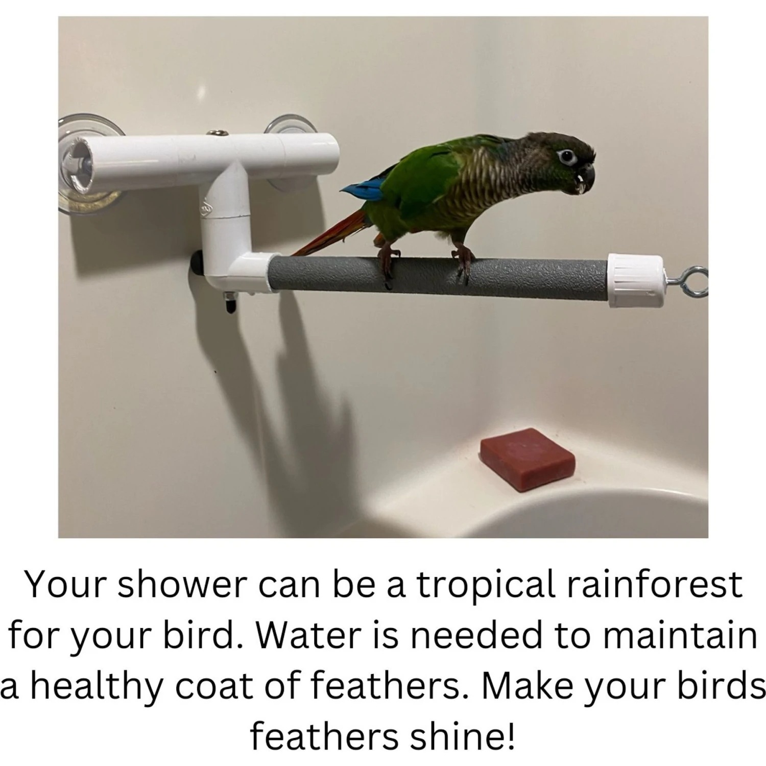 - Multipurpose perch turns any shower into a rainforest bath for parrots to keep them clean and healthy.