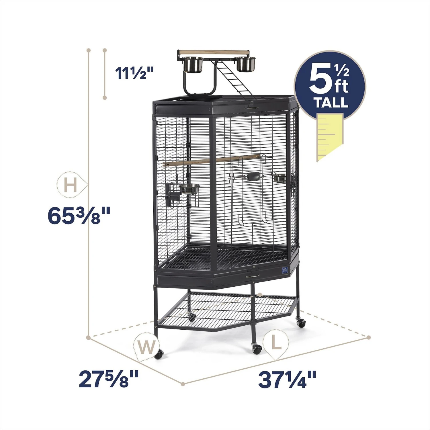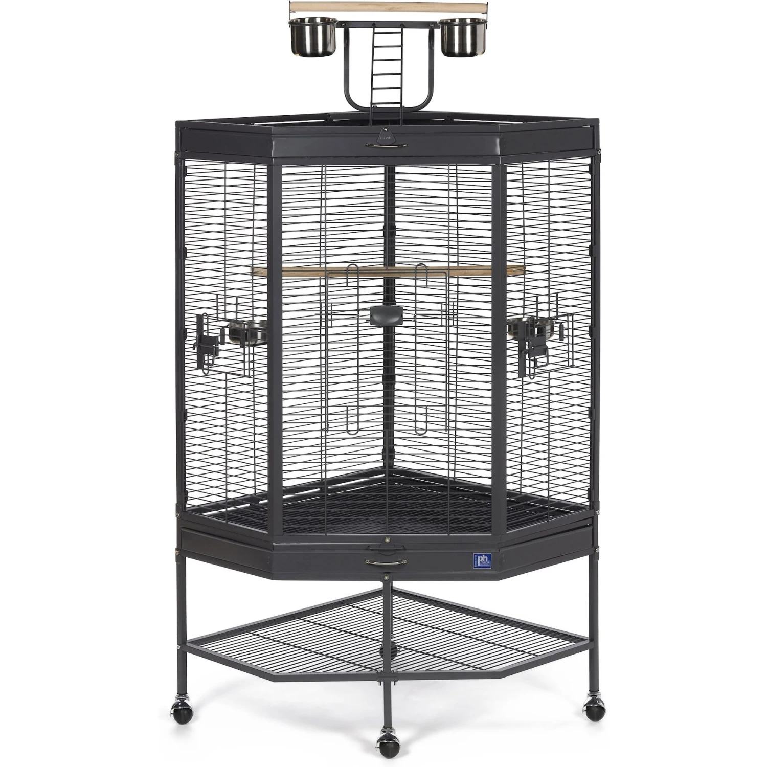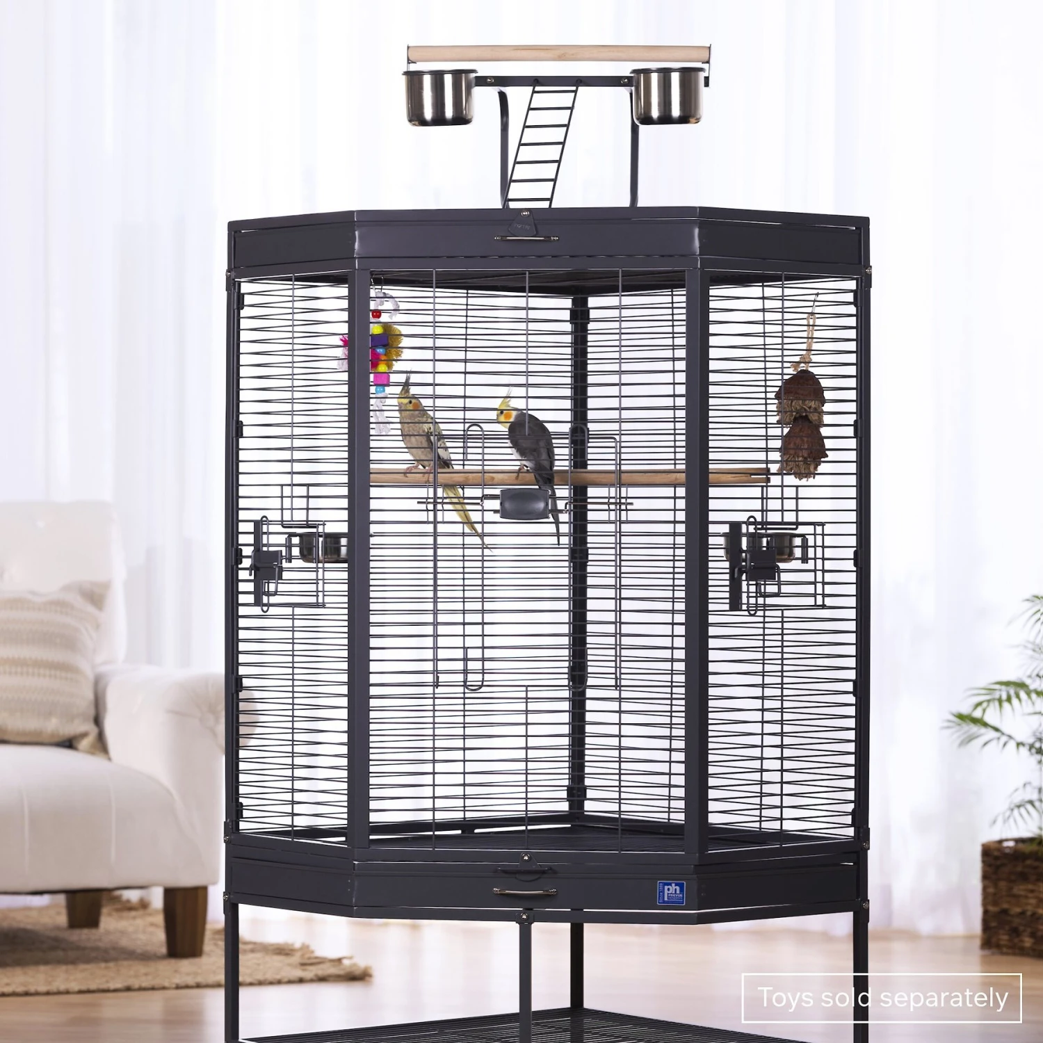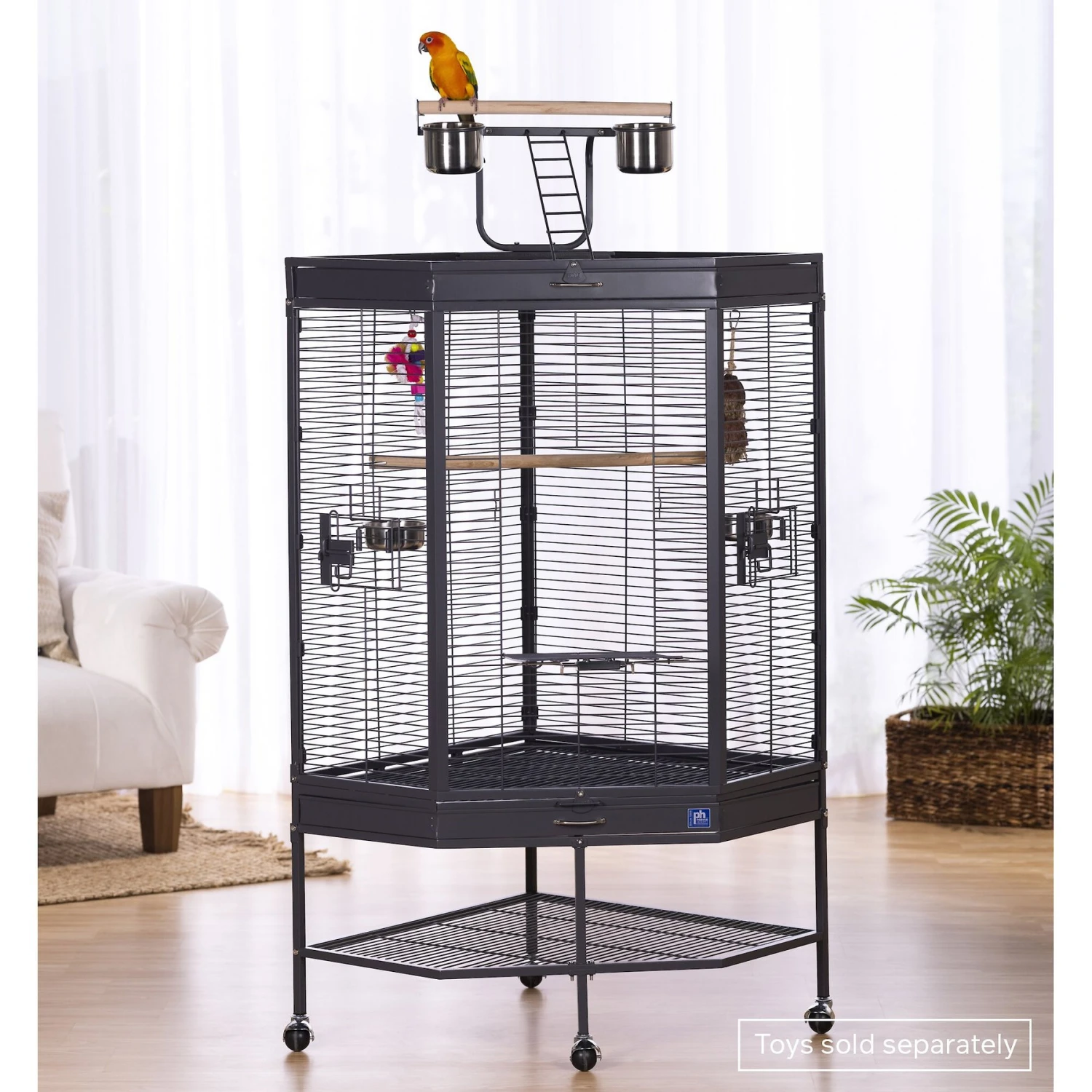 - Space-saving corner cage with ample interior living space for your feathered friend.
