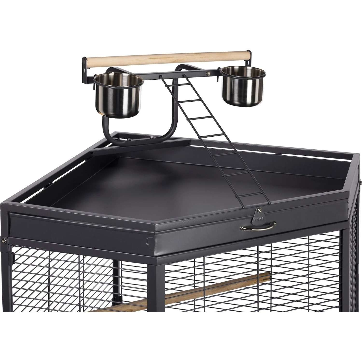 - Playtop includes a perch bar, 2 cups, a ladder and removable debris tray.