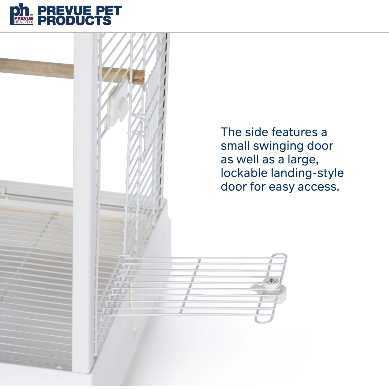 - Features a side panel landing-style door, two wood dowel perches, two food and water cups, and a pull-out grille and debris tray for easy cleaning!