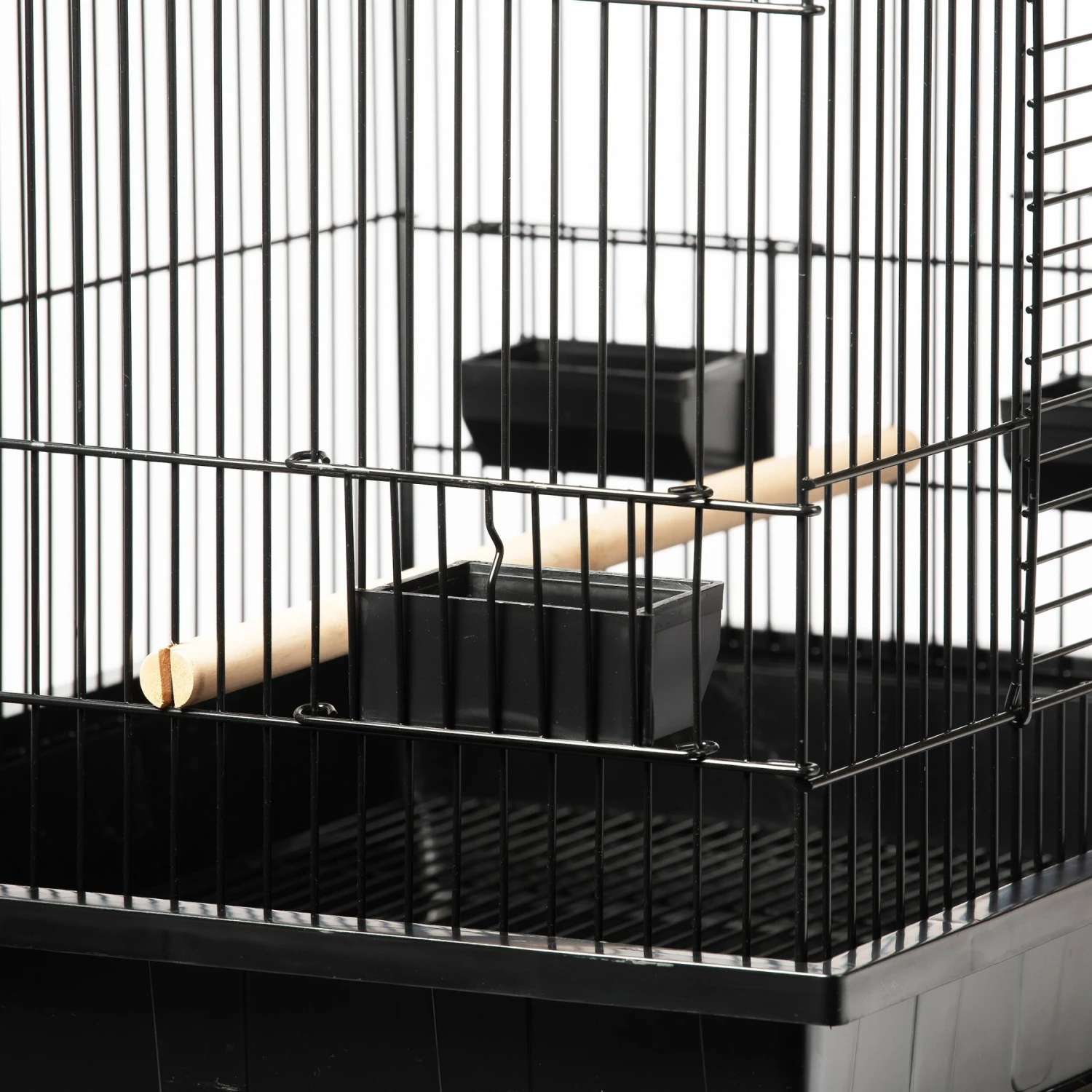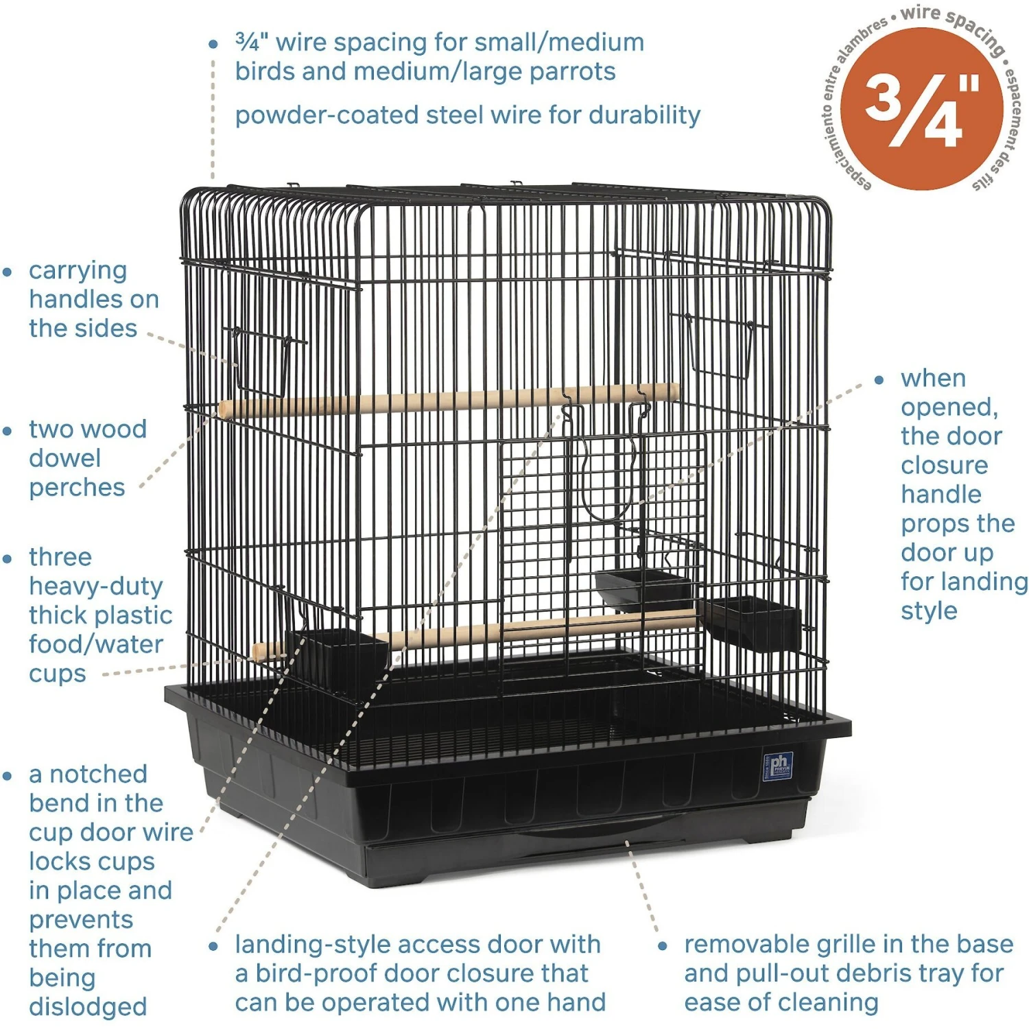 - Includes 2 wood perches and 3 heavy duty plastic dishes.