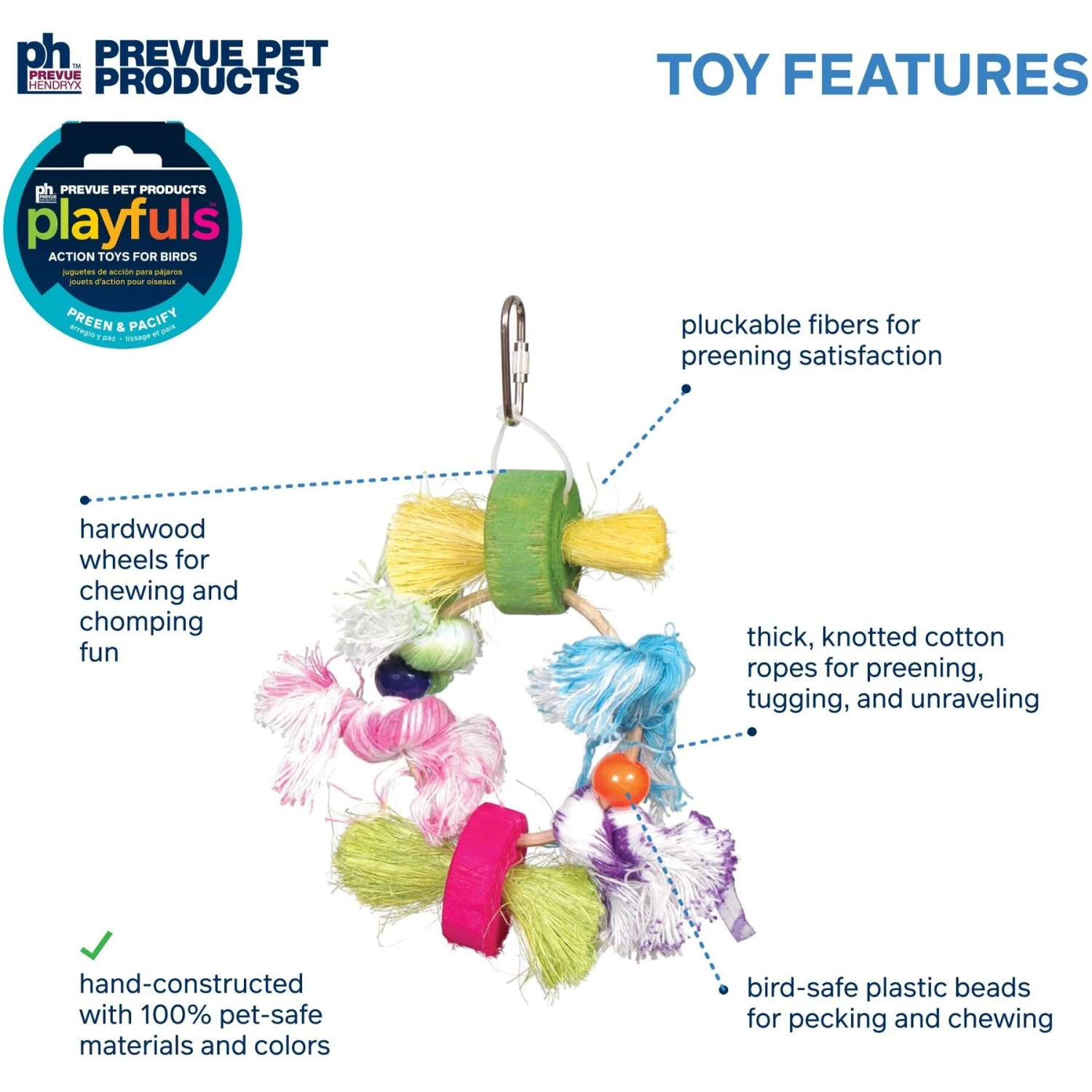 - Features colorful bird-safe beads for pecking and chewing.