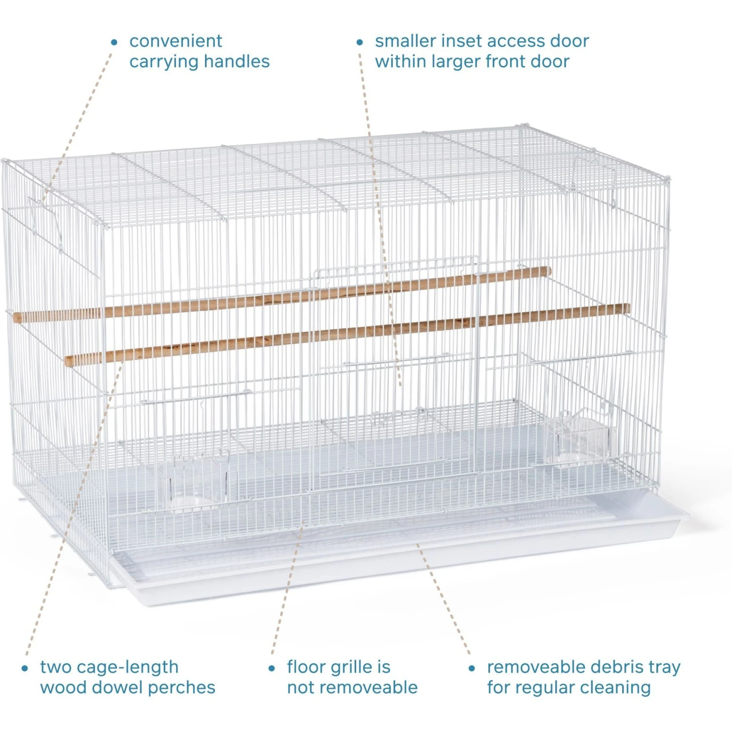 - Feeder cups and perches are designed to ensure cage interior remains spacious and attractive.