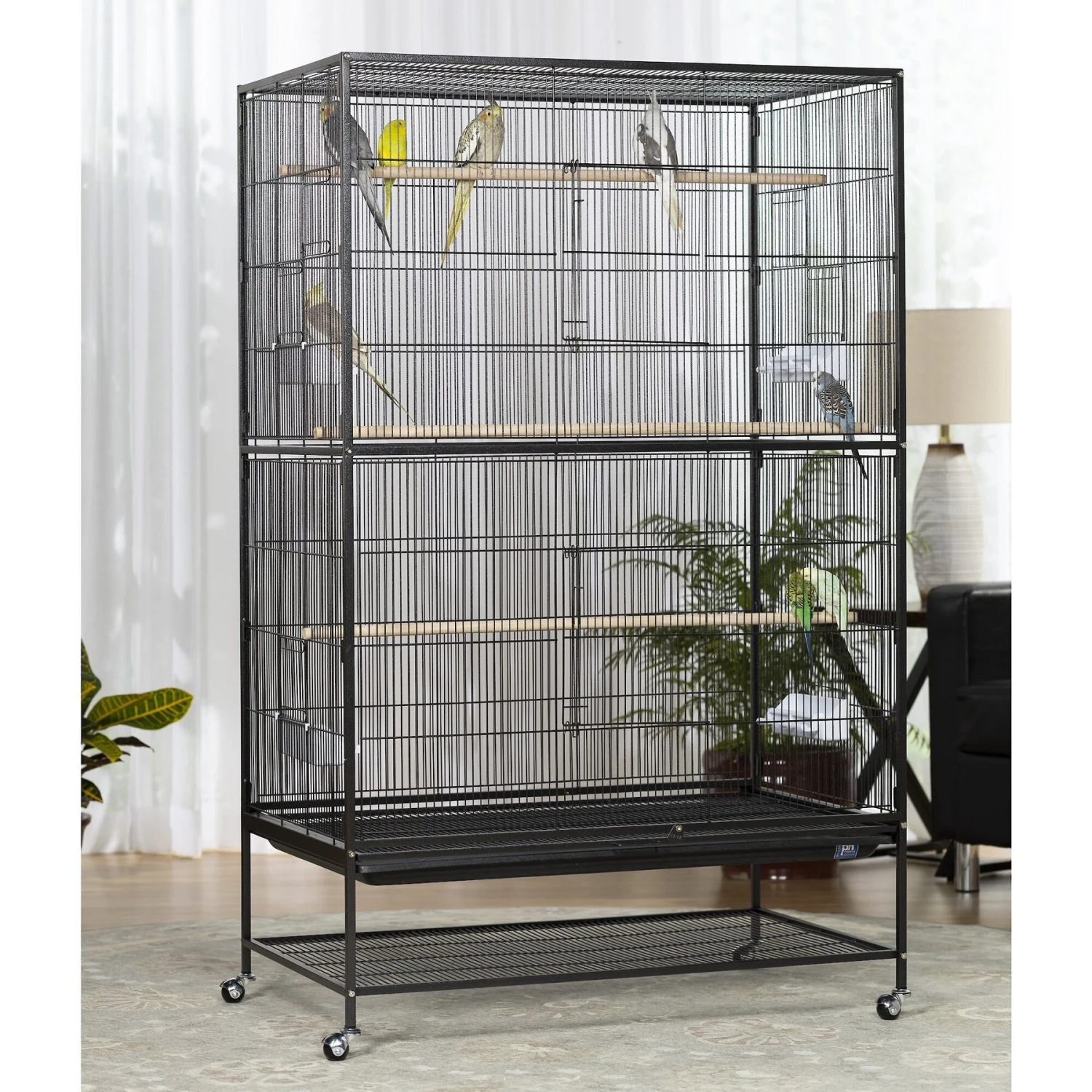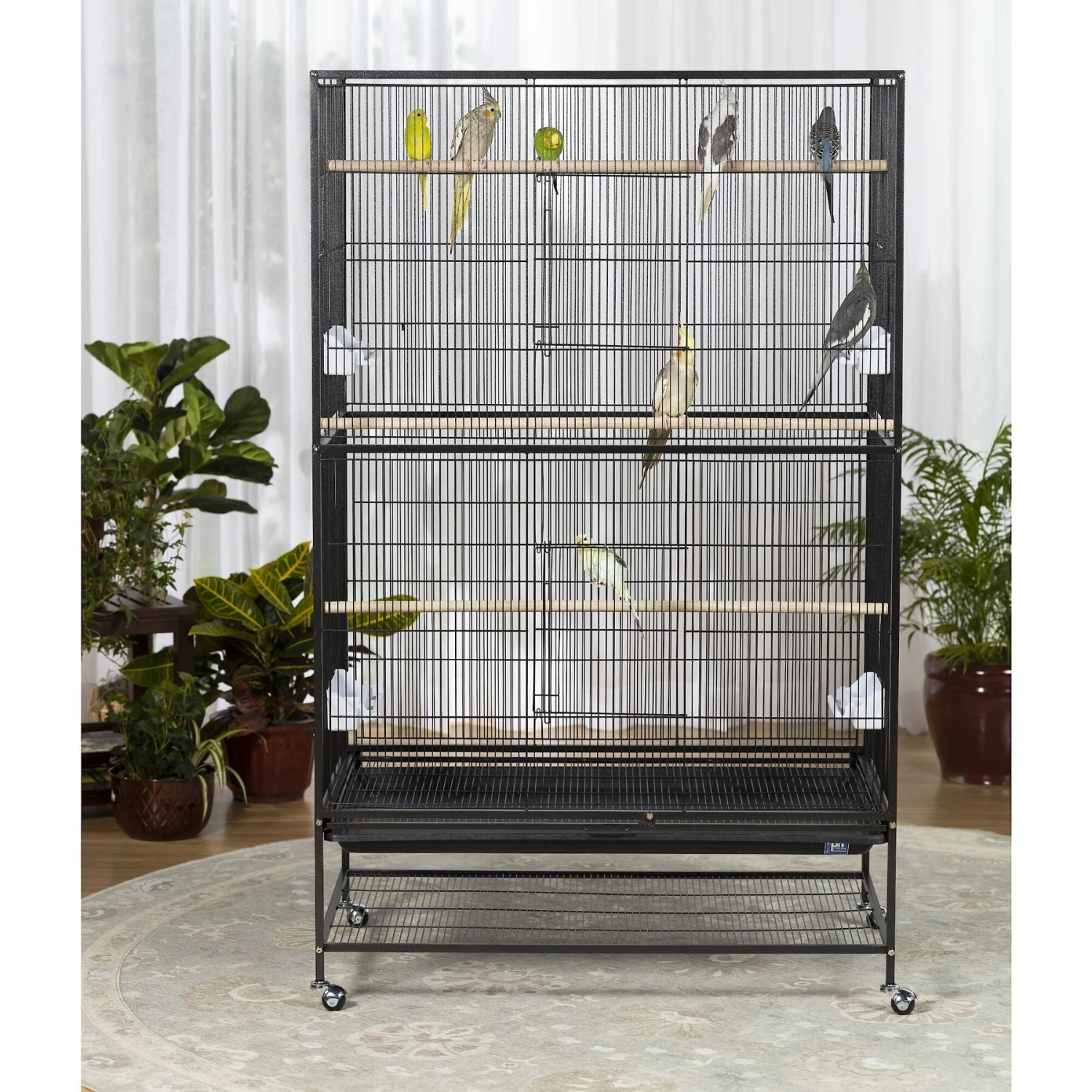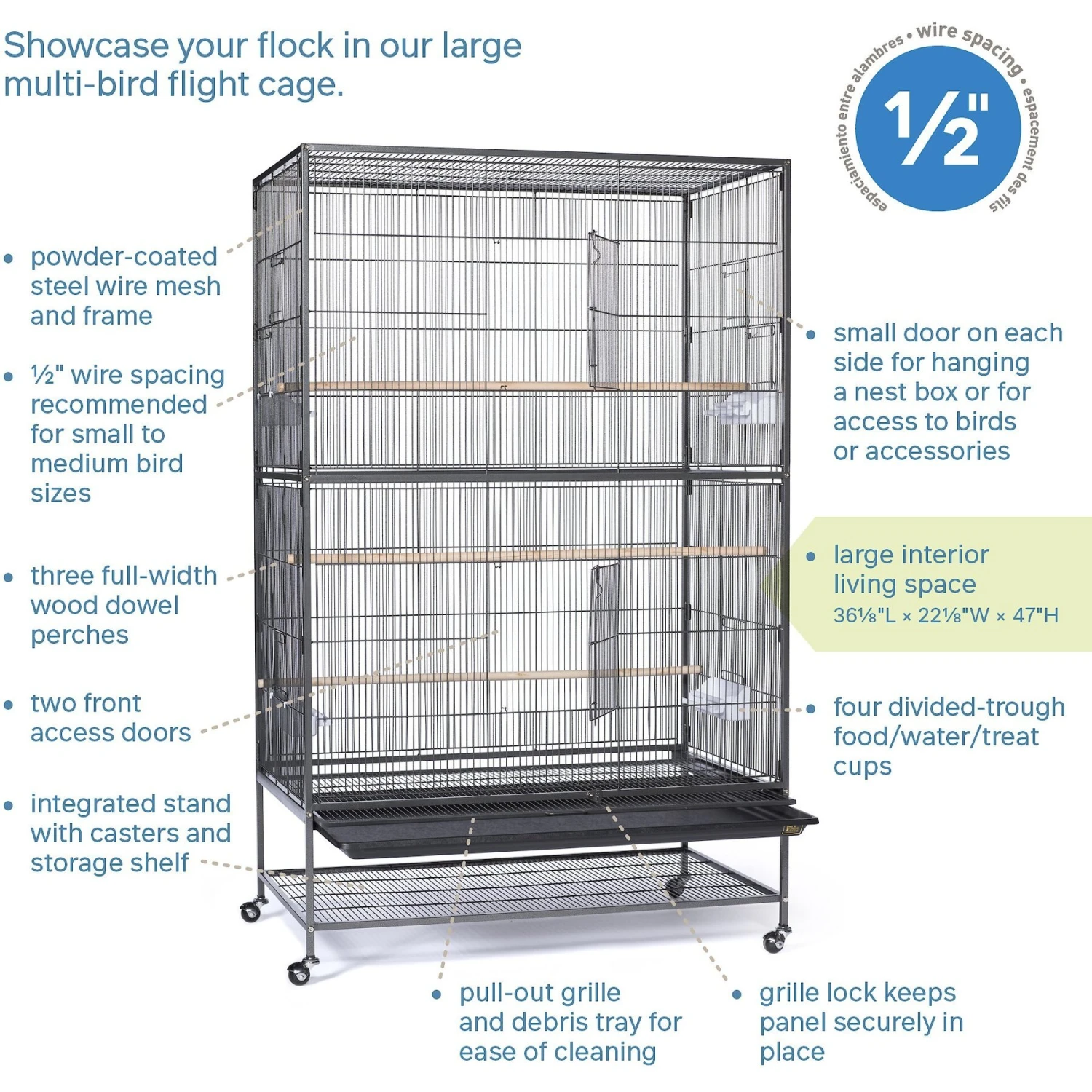 - Large, roomy powder-coated steel construction flight cage suitable for multiple small birds.
