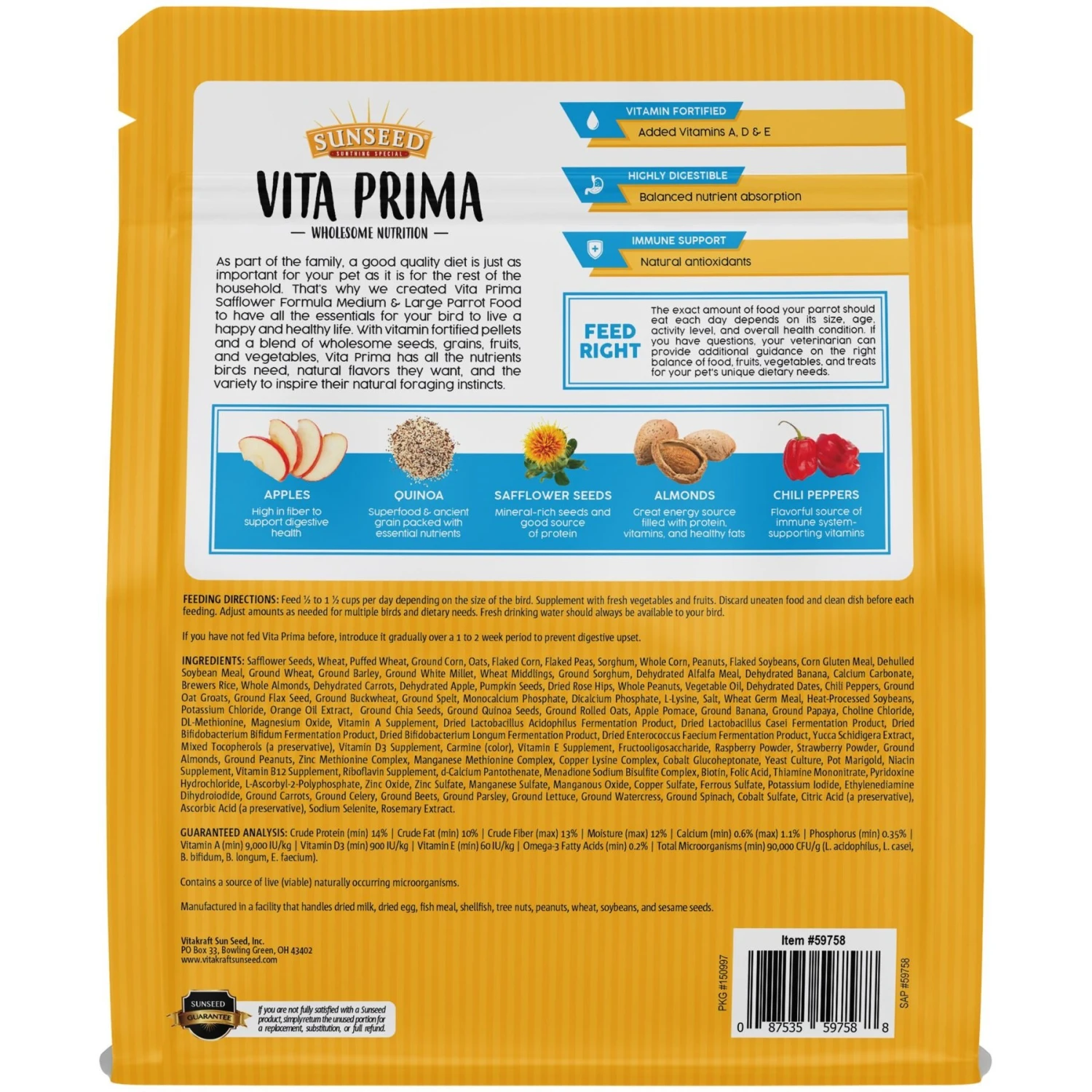 - Sunflower-free formula is a blend of seeds, ancient grains, fruits, vegetables, and vitamin fortified pellets.