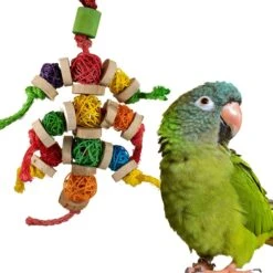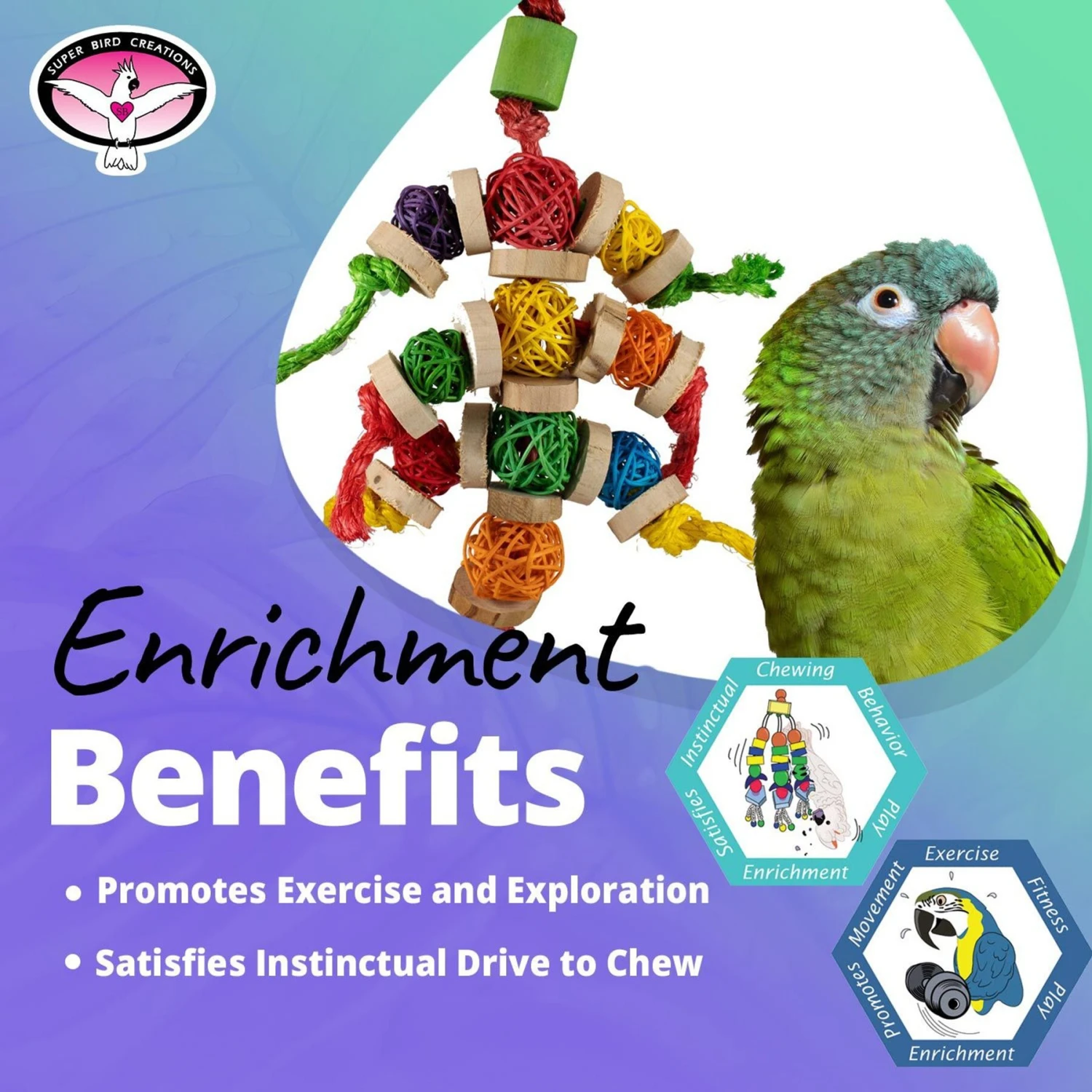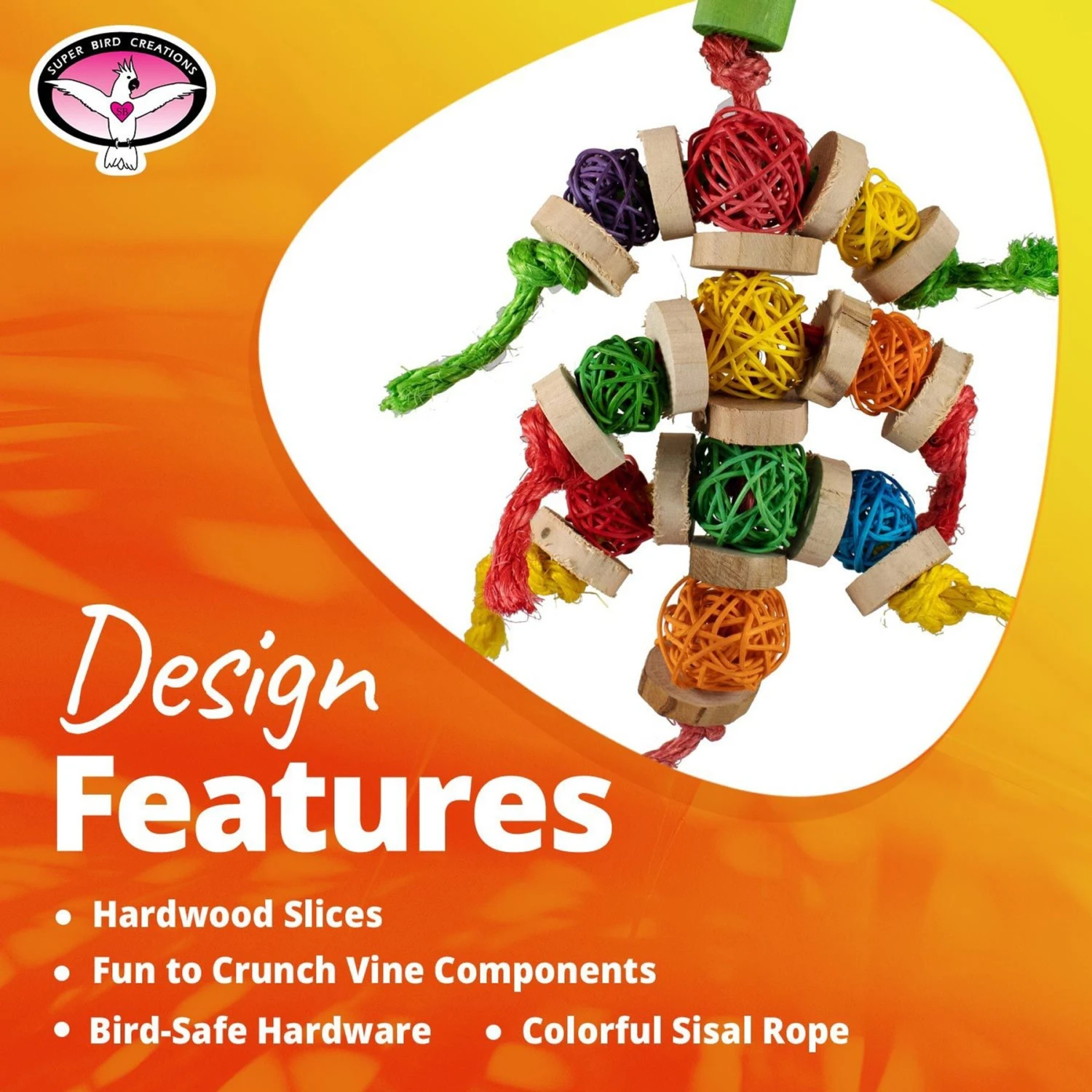 - Features vine balls, hardwood slices, sisal rope, and a bird-safe quick link.