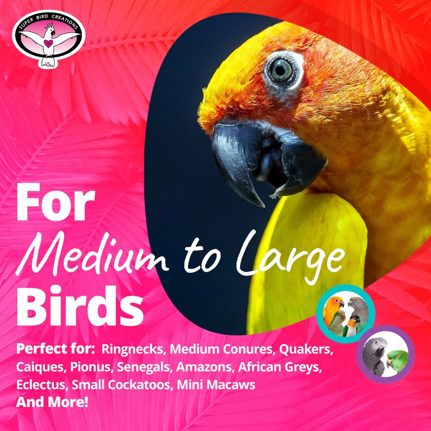 - Perfect for ringnecks, conures, quakers, caiques, Pionus parrots, Senegals, Amazons, African greys, eclectus, small cockatoos, mini macaws and other medium or large pet birds.