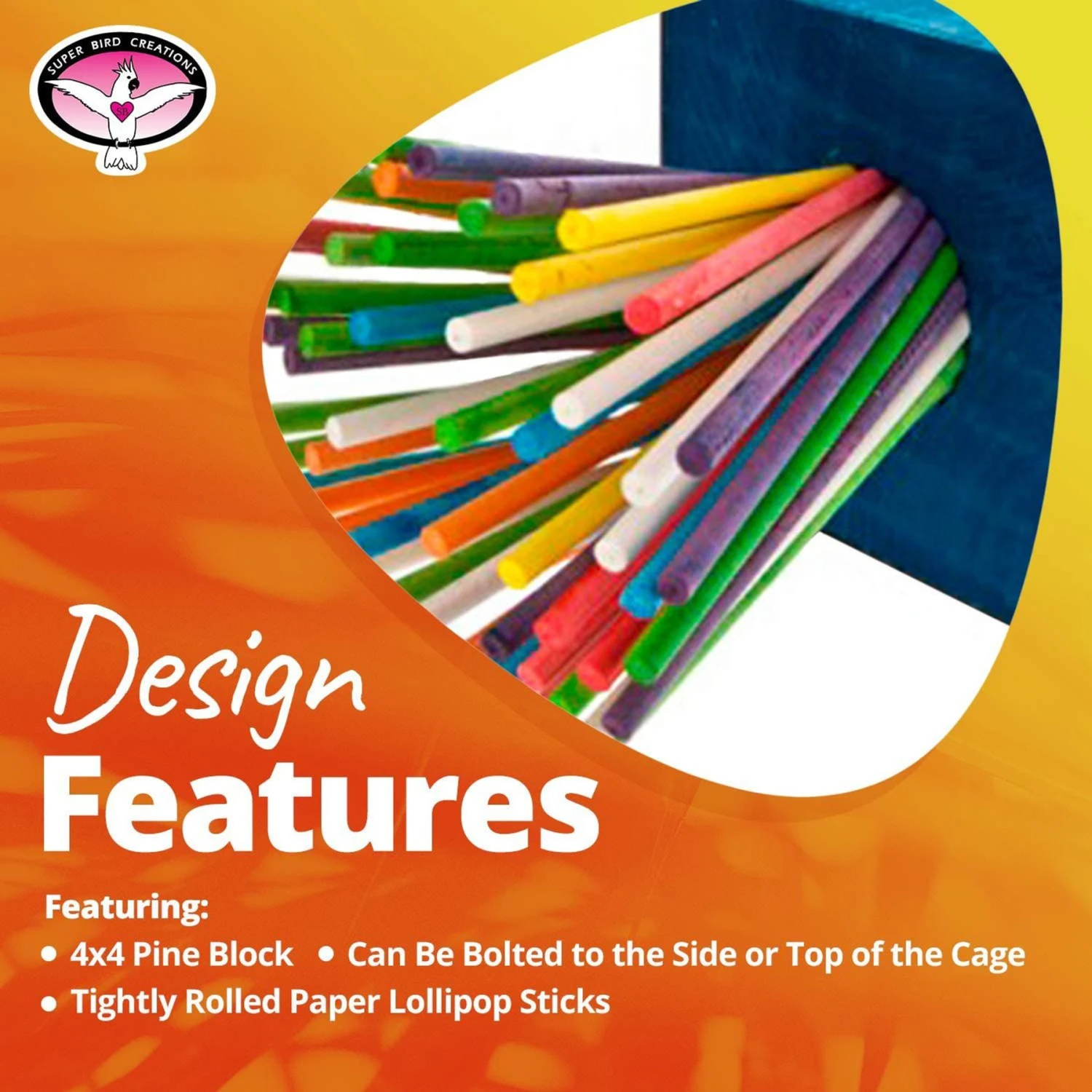- Sturdy wooden block easily bolts to the side of the cage.