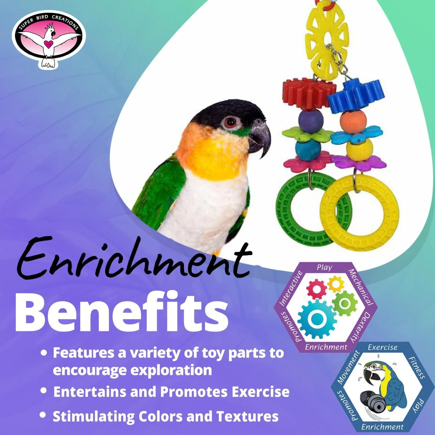 - Features wooden beads, colorful plastic gears, flower rings, and rotating wheels.