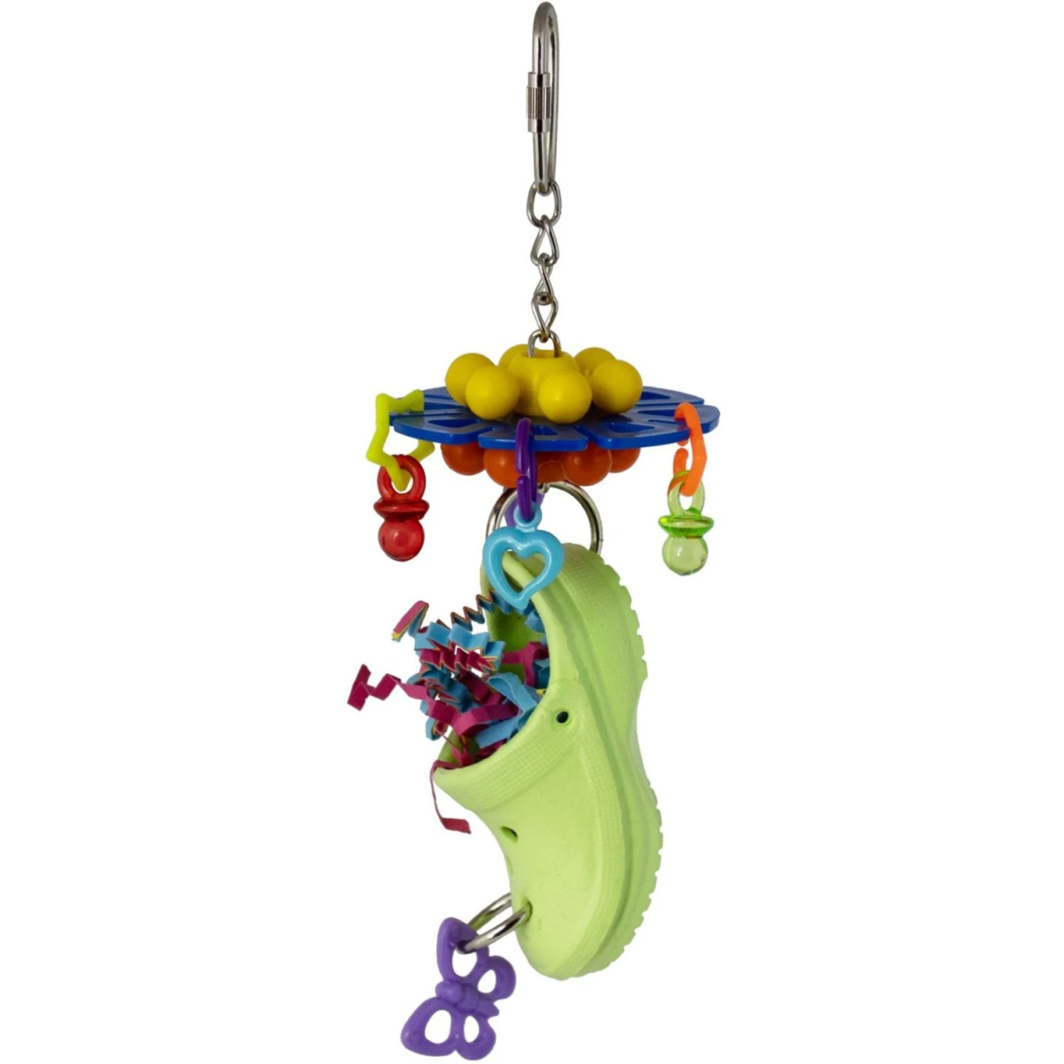 - Rubber croc-style shoe features crinkle paper, spinnable plastic wheels and dangling charms for hours of fun.