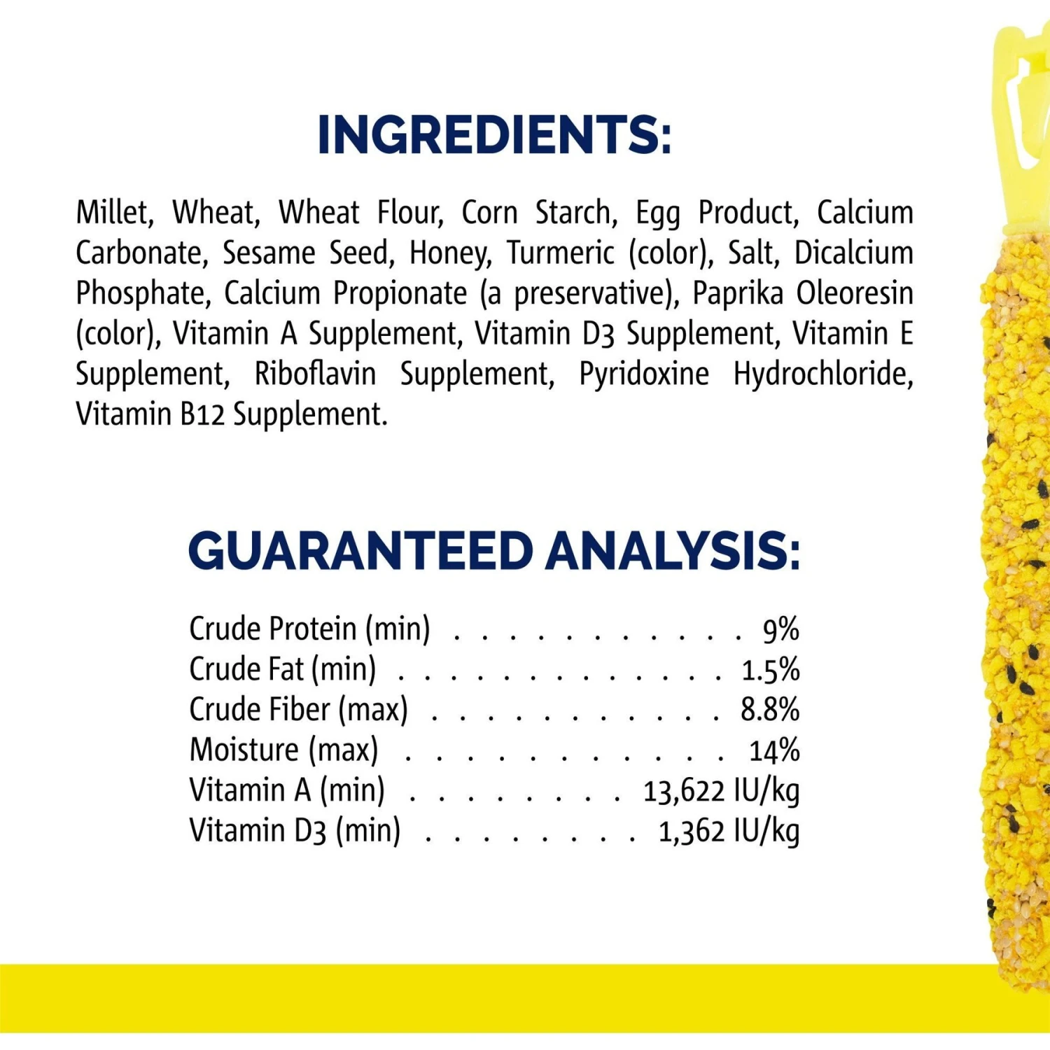 - Baked with select millet, seeds, eggs and honey, making this parakeet toy the perfect supplement to your pet’s daily meals.