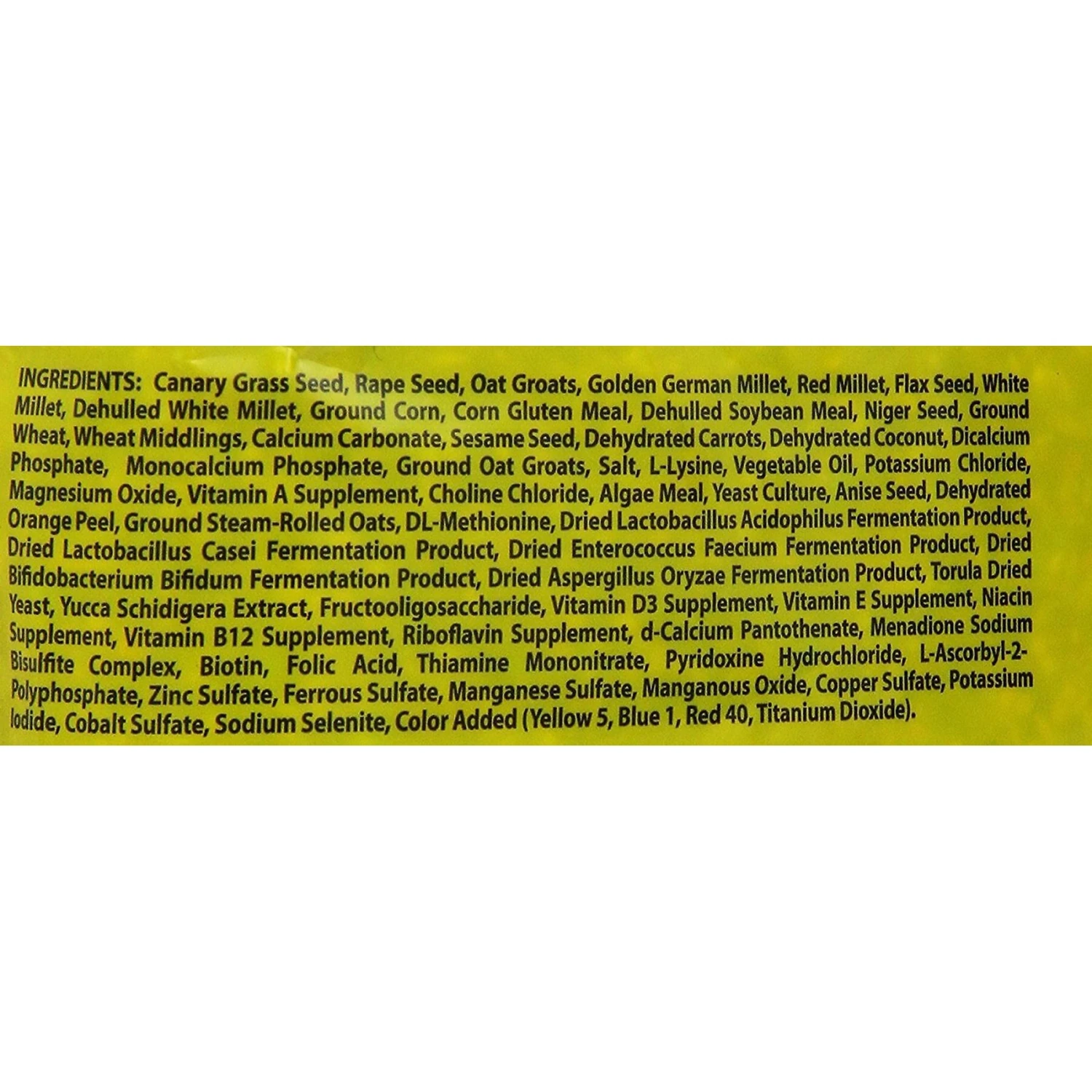 - Species-specific formula includes canary grass seed, millet seed, rape seed, oats, sesame, carrots, coconut, orange, and anise.