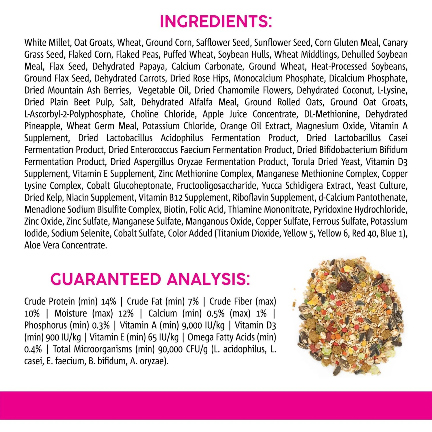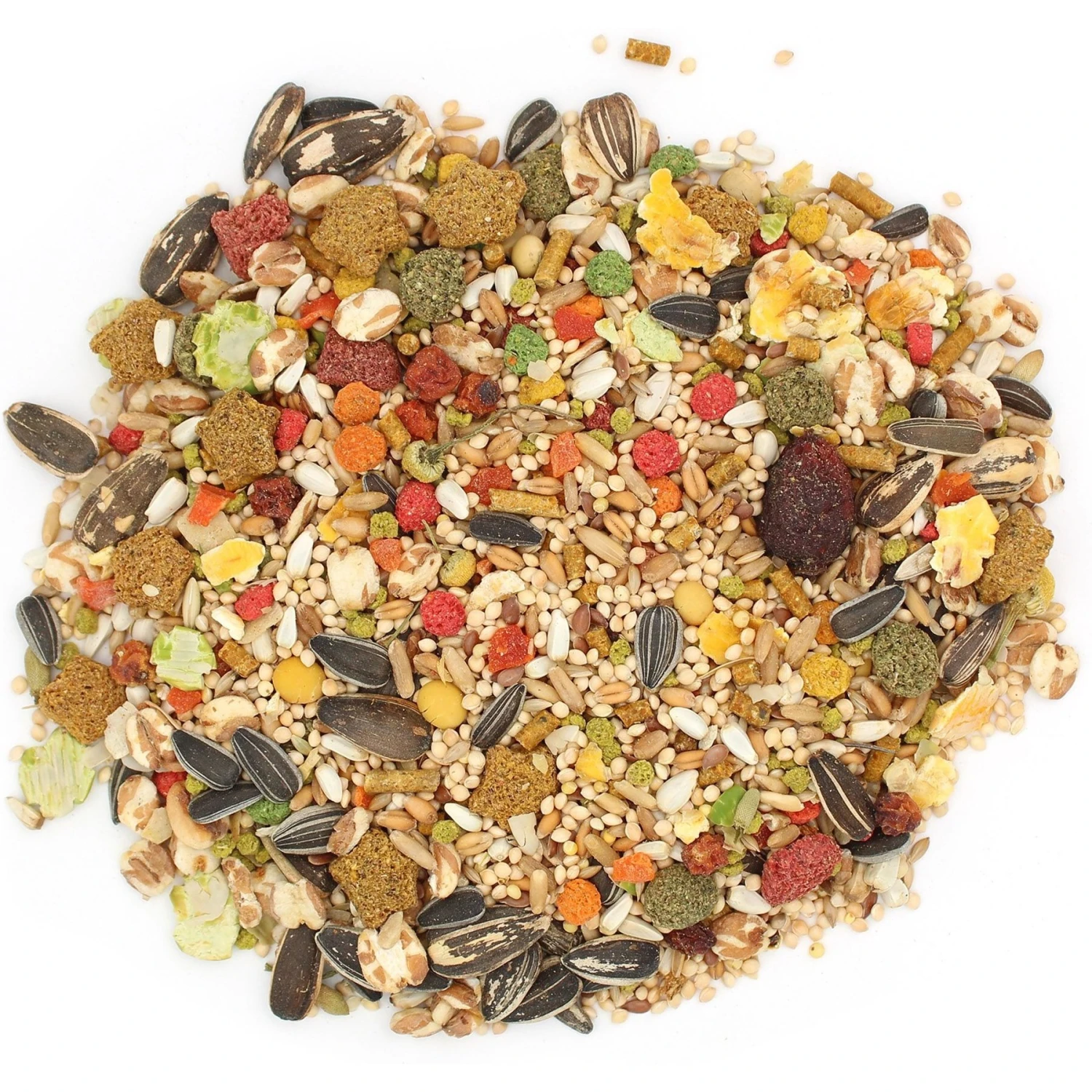 - Exciting blend of millet seed, safflower seed, peas, papaya, carrots, rose hips, berries, chamomile flowers and pineapple.