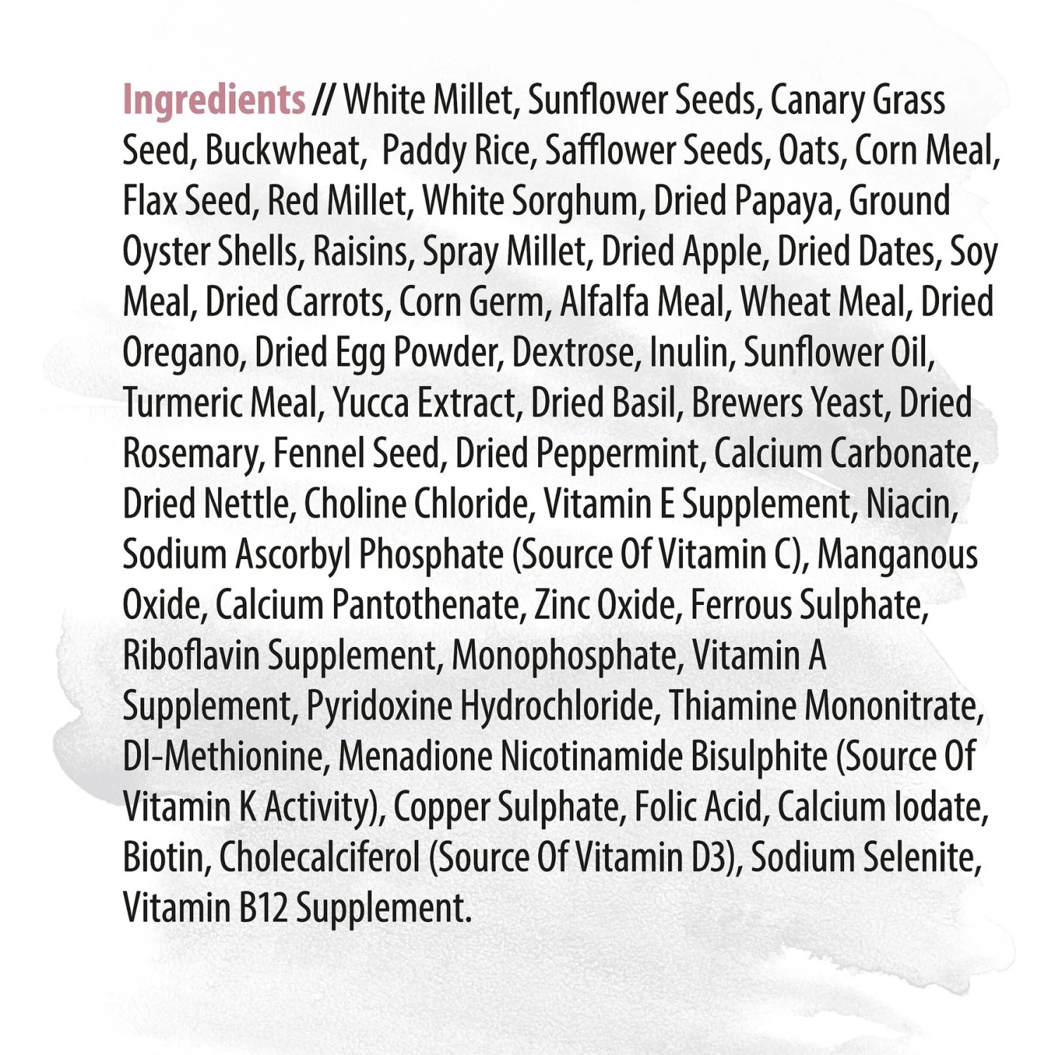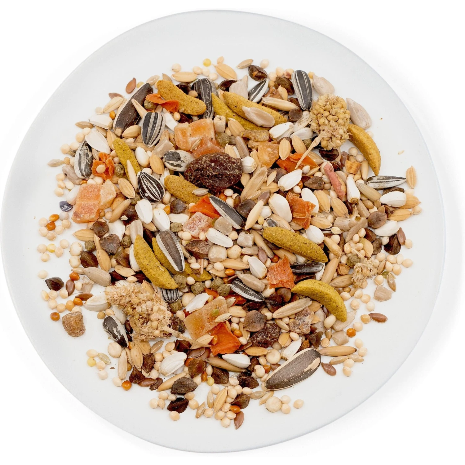 - Protein-dense recipe with linseed promotes dazzling feathers and helps facilitate moulting.