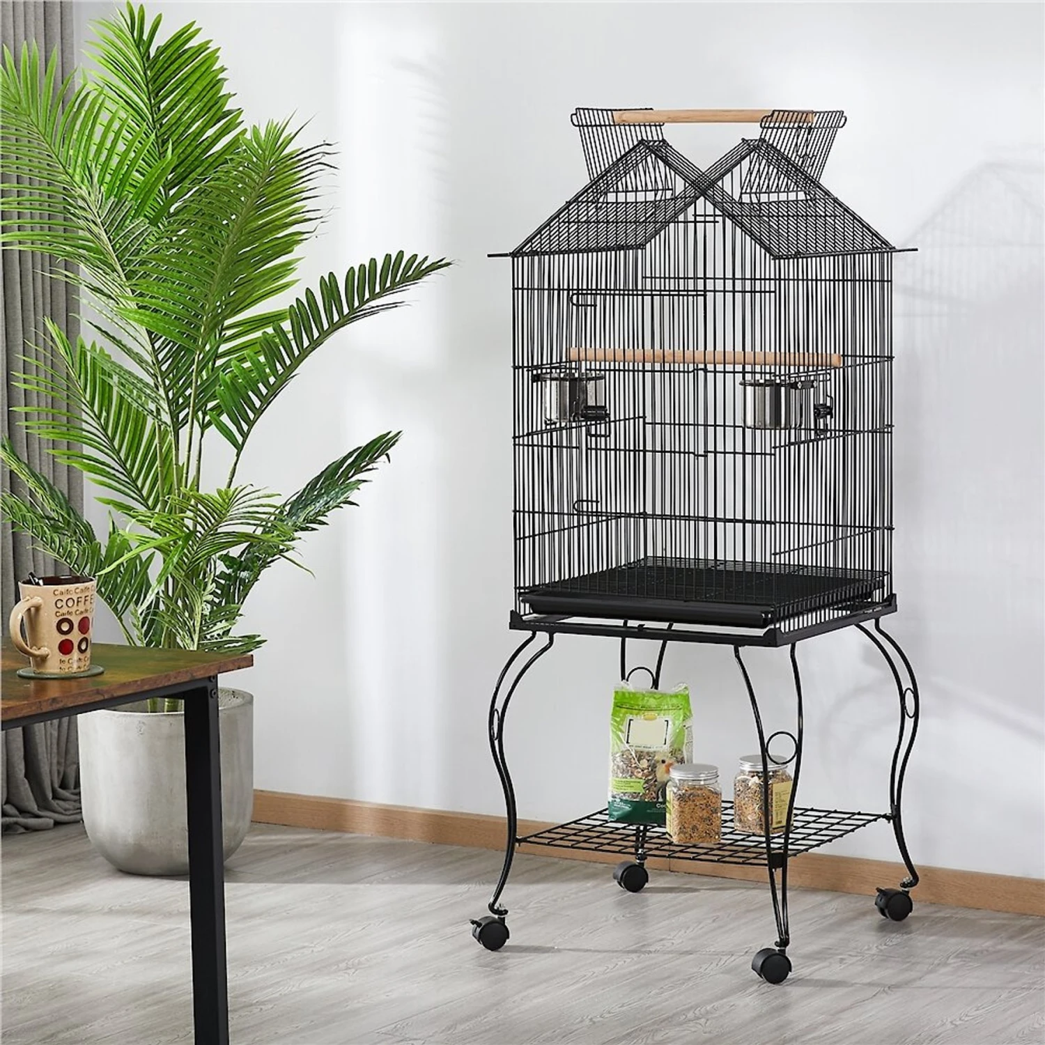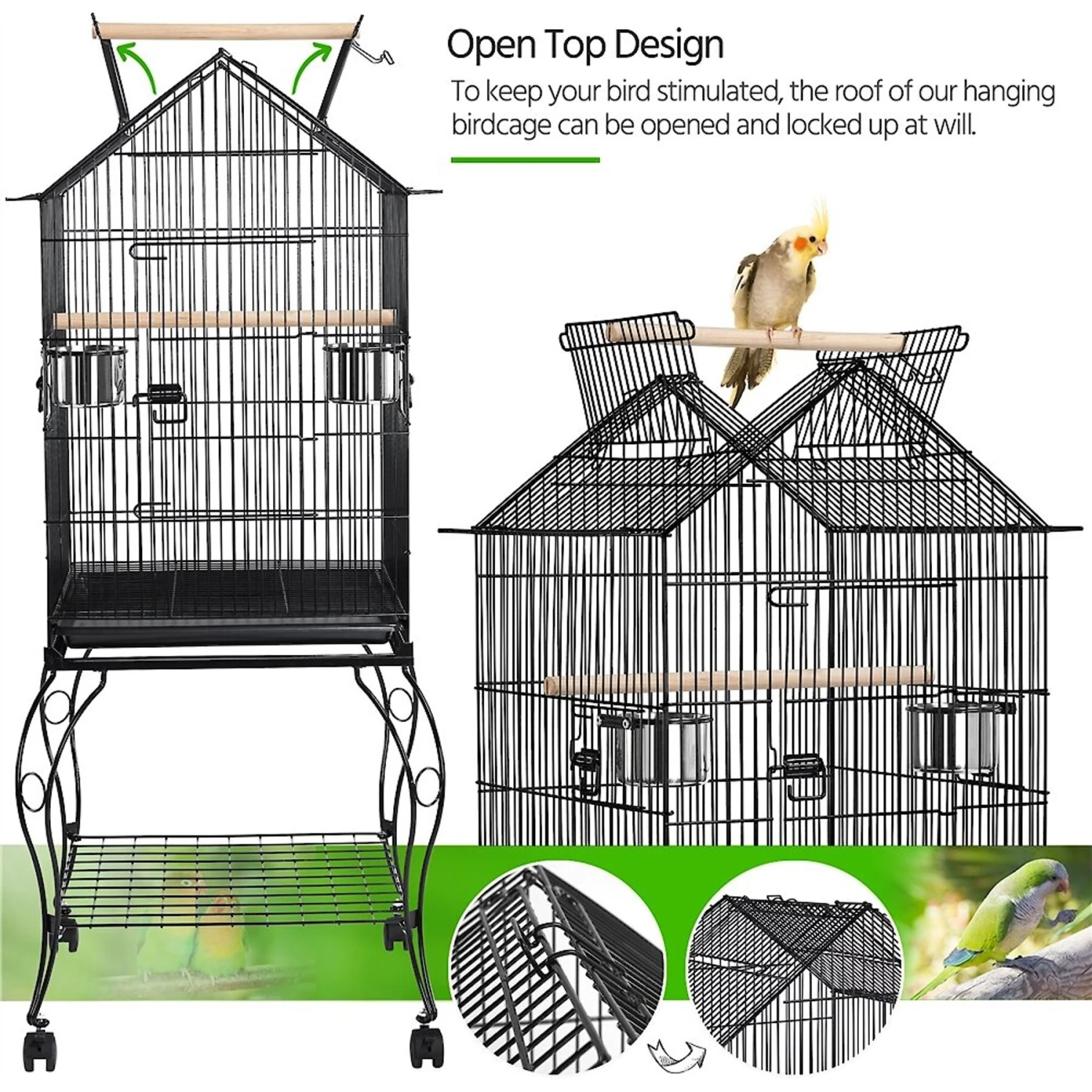 - The open top with a wood perch above the birdcage provides your feathered friend with much-needed stimulation and the freedom to roam.
