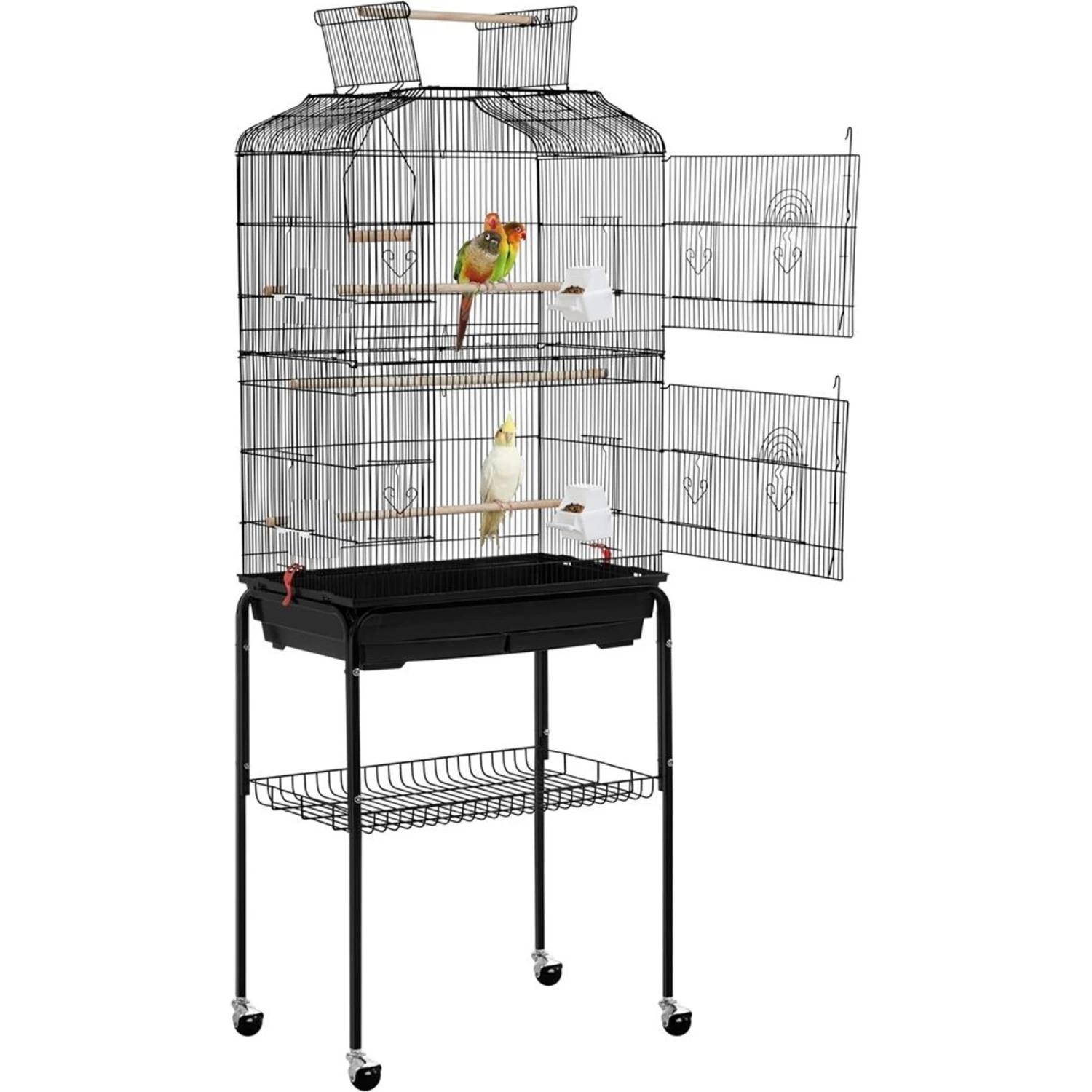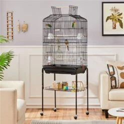 - Crafted from solid metal and finished with water- and oxidant-resistant paint, this rolling bird cage is strong and easy to clean.